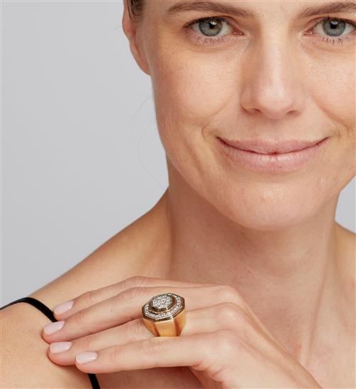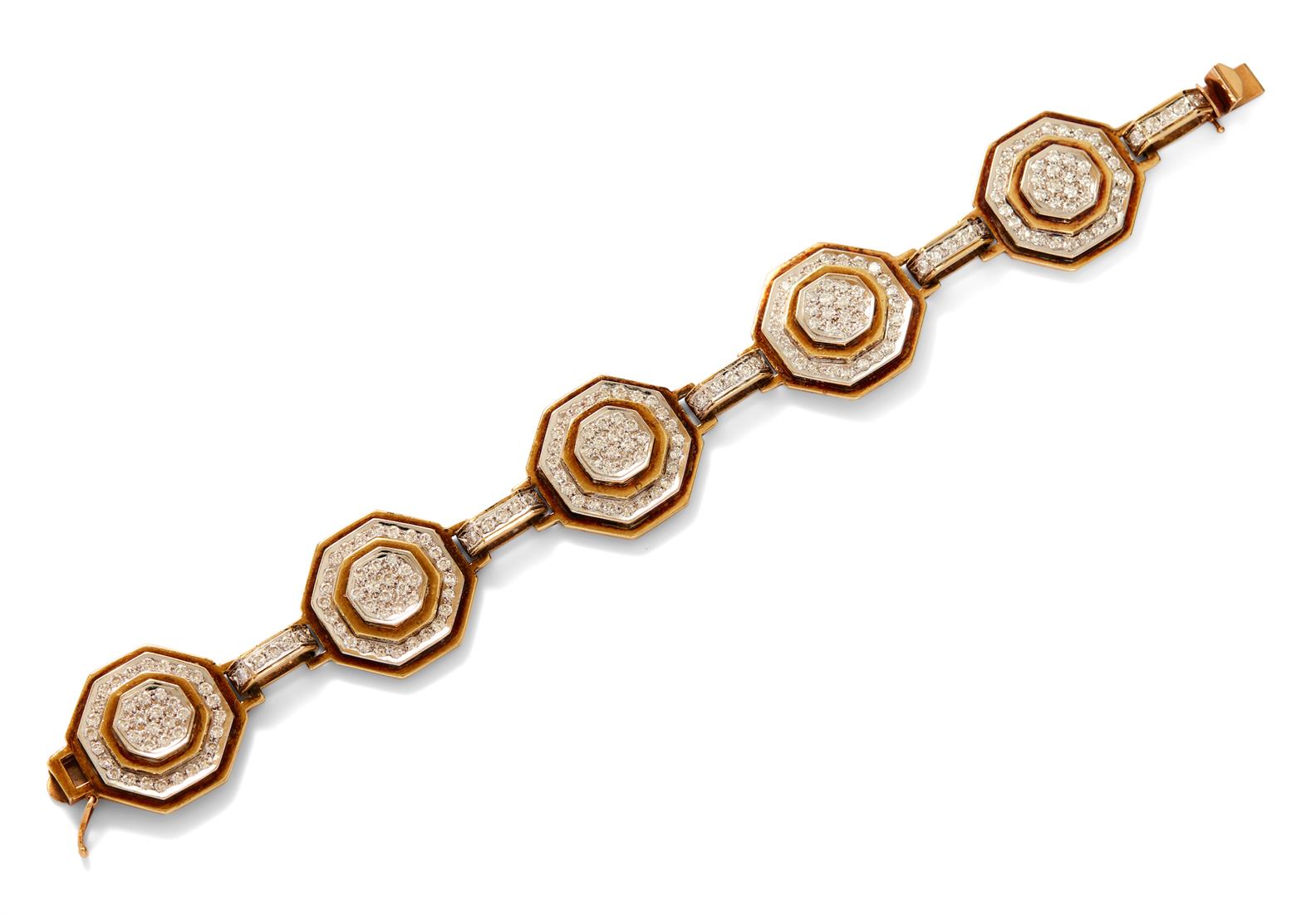 Composed of: a bracelet modelled as a line of octagonal plaques pavé-set with brilliant-cut diamonds alternating between similarly set geometrical connectors; a ring to match, size M, the diamonds together weighing approximately 7.60 carats, length 190mm (2).