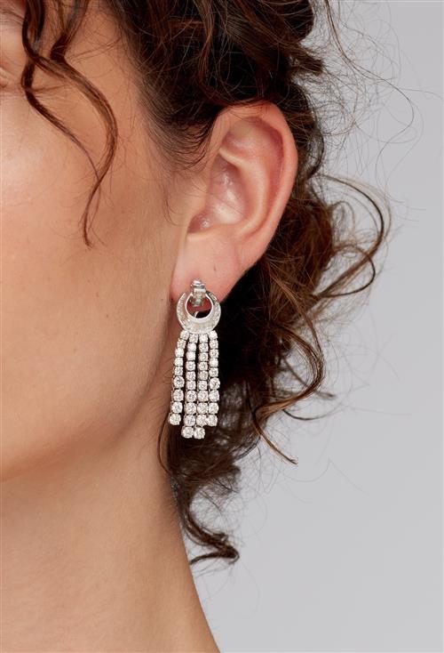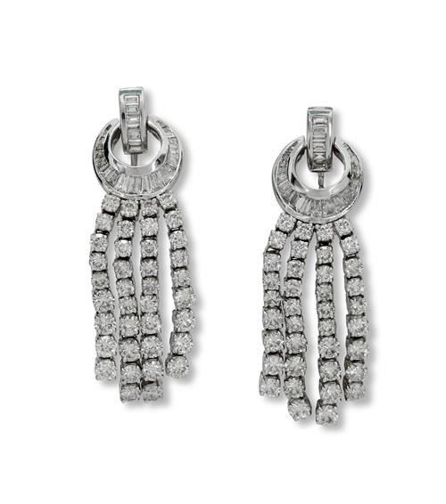 Each terminating in four lines of claw-set diamond tassels supported from an openwork crescent surmount decorated with channel-set baguette diamonds, the small diamonds together weighing approximately 8.00 carats, mounted in 18ct white gold, length 48mm, post and clip fittings.