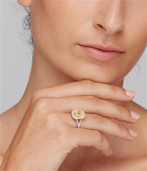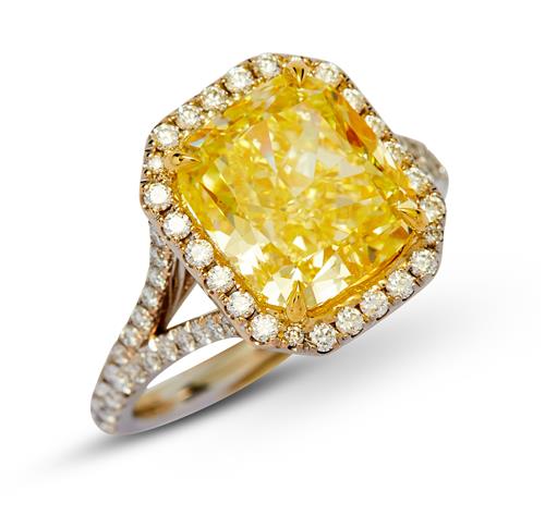 Of cluster design, centring a claw-set cushion-shaped modified brilliant-cut fancy yellow diamond weighing 5.03 carats, framed by a halo of near colourless brilliant-cut diamonds, to similarly set split shoulders, the small diamonds together weighing approximately 0.78 carats, mounted in 18ct bicolour gold, size L.