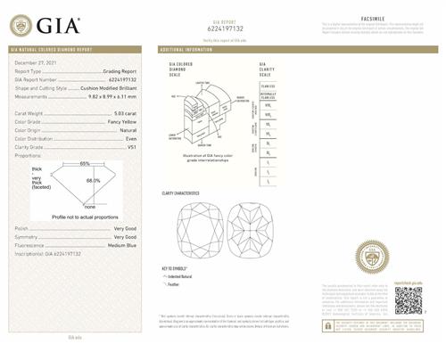 Accompanied by a GIA report numbered 6224197132, dated 27 December 2021, stating that the 5.03 carat diamond is natural, fancy yellow colour, VS1 clarity, laser inscribed.