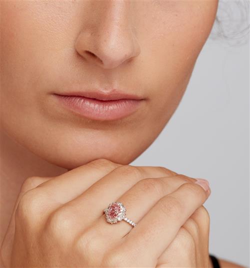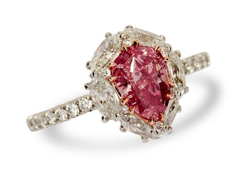 Of cluster design, centring a pear mixed cut fancy vivid pink diamond weighing 1.03 carats, framed by a line of near colourless brilliant-cut, oval and pear-shaped diamonds, the bridge and shoulders pavé-set with brilliant-cut diamonds, the near colourless diamonds together weighing approximately 1.50 carats, mounted in platinum and 18ct pink gold, size L.