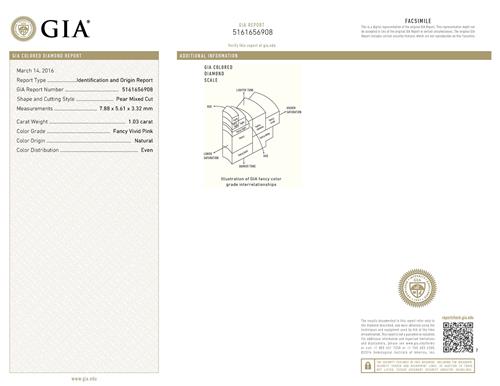 Accompanied by a GIA report numbered 5161656908, dated 14 March 2016, stating that the 1.03 carat diamond is natural, fancy vivid pink colour.
