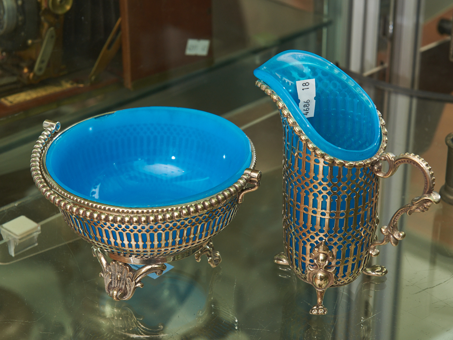 A SILVER PLATE BLUE GLASS LINED SUGAR BOWL AND CREAM JUG H.13.5CM (TALLEST), LEONARD JOEL LOCAL DELIVERY: SMALL