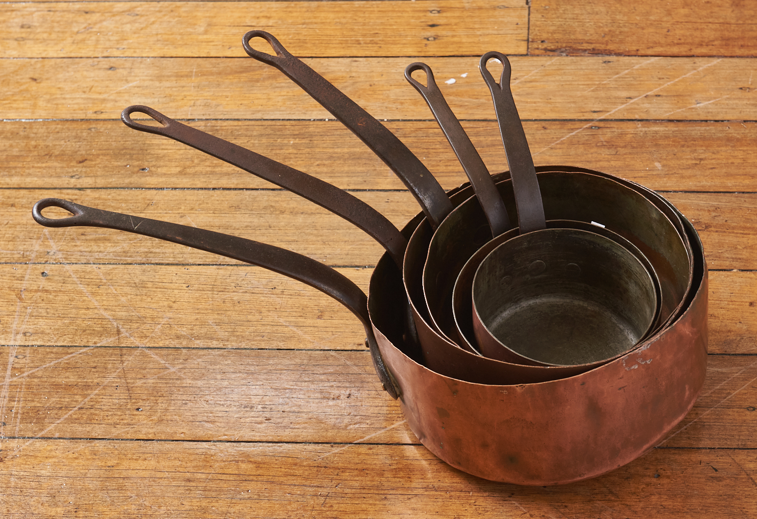 A SET OF FIVE 19TH-CENTURY FRENCH COPPER SAUCEPANS DIA.26CM (LARGEST), LEONARD JOEL LOCAL DELIVERY: MEDIUM