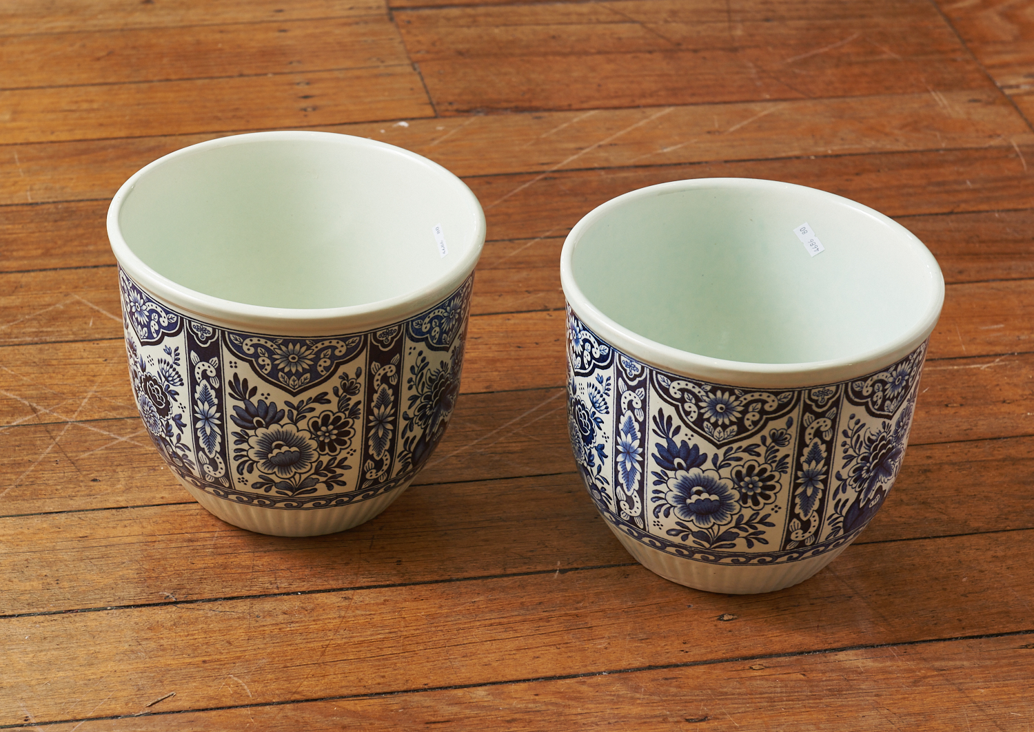 A PAIR OF MID 20TH CENTURY DUTCH DELFS BOCH PHOENIX BLUE AND WHITE PLANTERS, H.20.5 X DIA.24CM, LEONARD JOEL LOCAL DELIVERY: MEDIUM