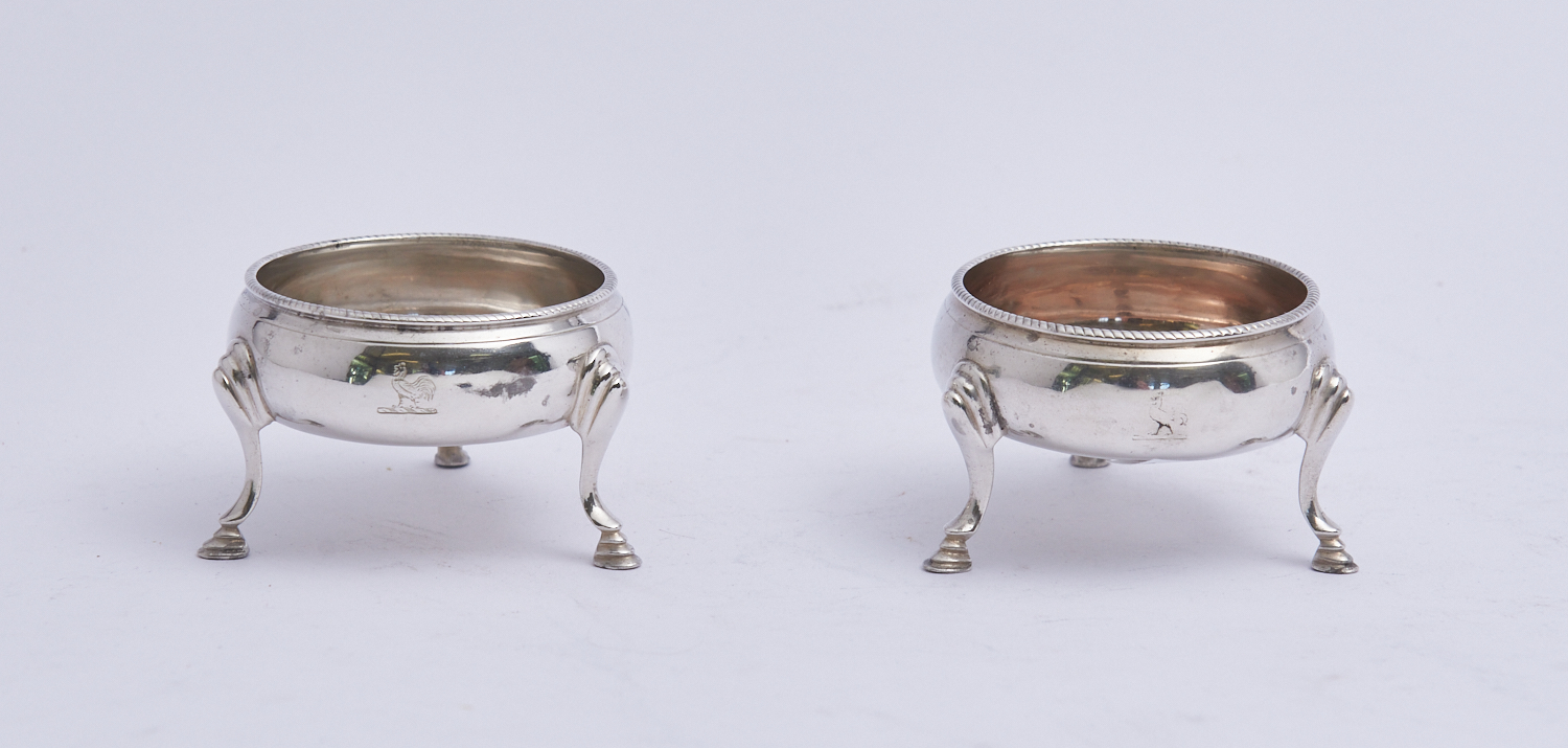 A PAIR OF GEORGIAN STERLING SILVER THREE FOOT OPEN SALTS WITH ROOSTER CREST – 90 GRAMS H.3.5CM X DIA.6CM, LEONARD JOEL LOCAL DELIVERY: SMALL