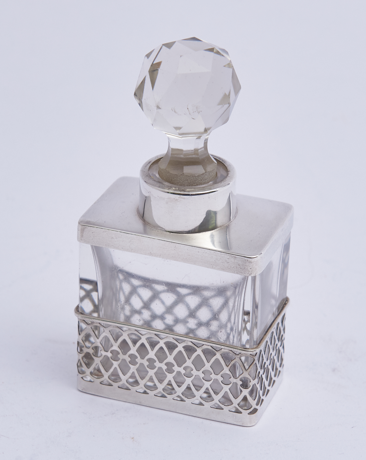 A STERLING SILVER CASED PERFUME BOTTLE WITH PIERCED BASE DECORATION (A/F) H.10.5CM, LEONARD JOEL LOCAL DELIVERY: SMALL