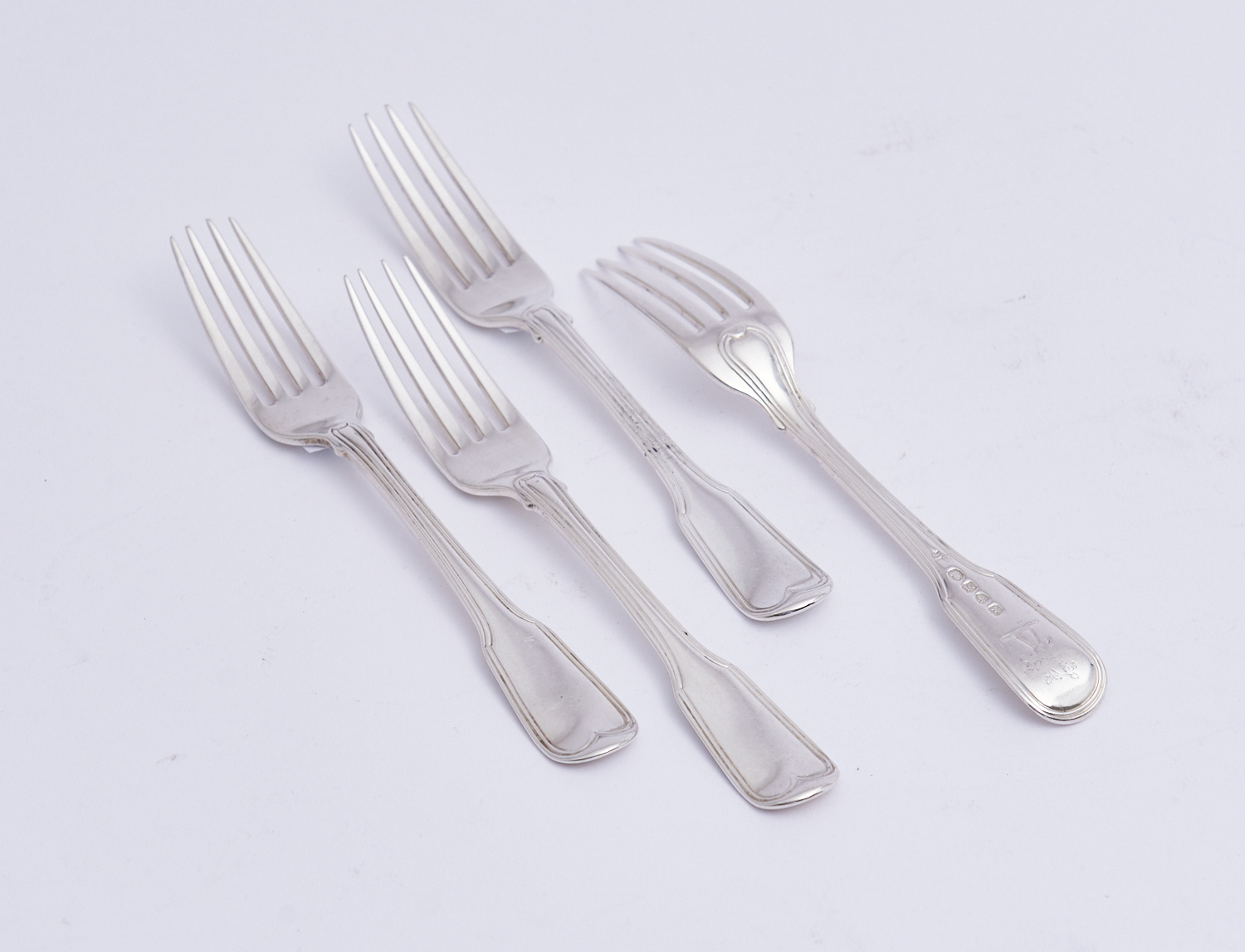 FOUR GEORGIAN STERLING SILVER ENTREE FORKS – 196 GRAMS WITH CRESTS TO UNDERSIDE L.16CM, LEONARD JOEL LOCAL DELIVERY: SMALL