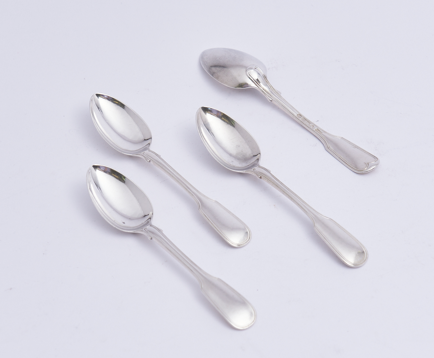 FOUR GEORGIAN STERLING SILVER TEA SPOONS – 132 GRAMS WITH CRESTS TO UNDERSIDE L.14CM, LEONARD JOEL LOCAL DELIVERY: SMALL