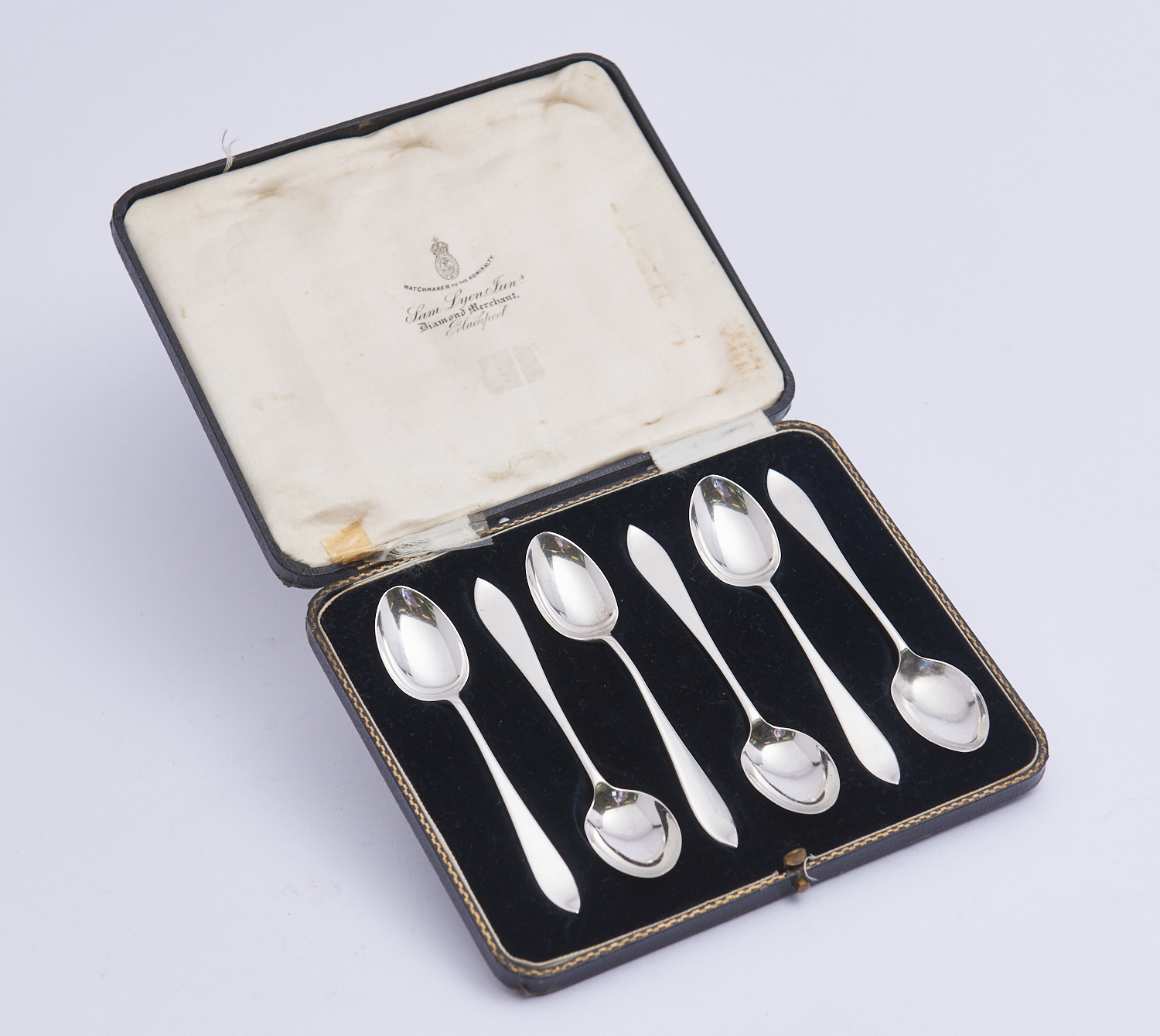 A CASED SET OF SIX STERLING SILVER TEASPOONS – 50 GRAMS, LEONARD JOEL LOCAL DELIVERY: SMALL