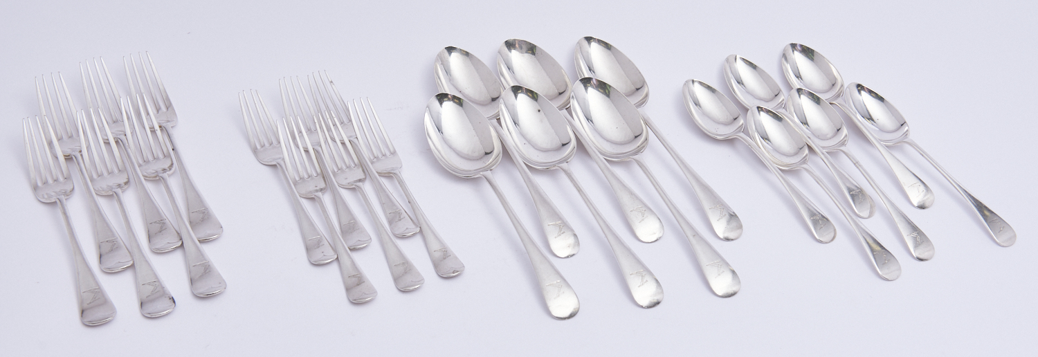 24 PIECES OF CRESTED STERLING SILVER CUTLERY INCLUDING 6 TABLE SPOONS 6 TABLE SPOONS 6 ENTRÉE FORKS AND 6 DINNER FORKS - 1476 GRAMS, LEONARD JOEL LOCAL DELIVERY: SMALL