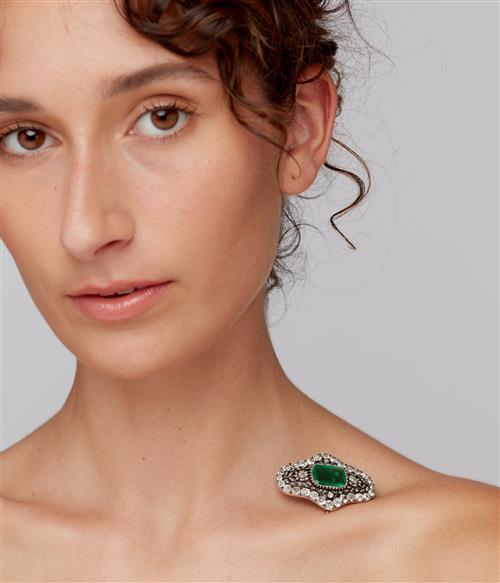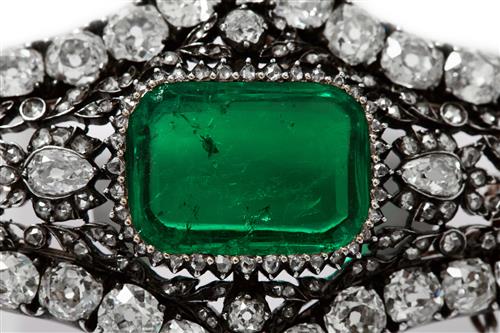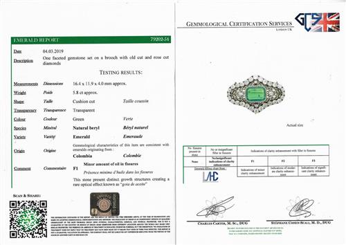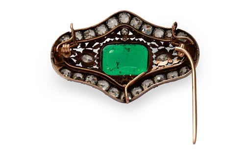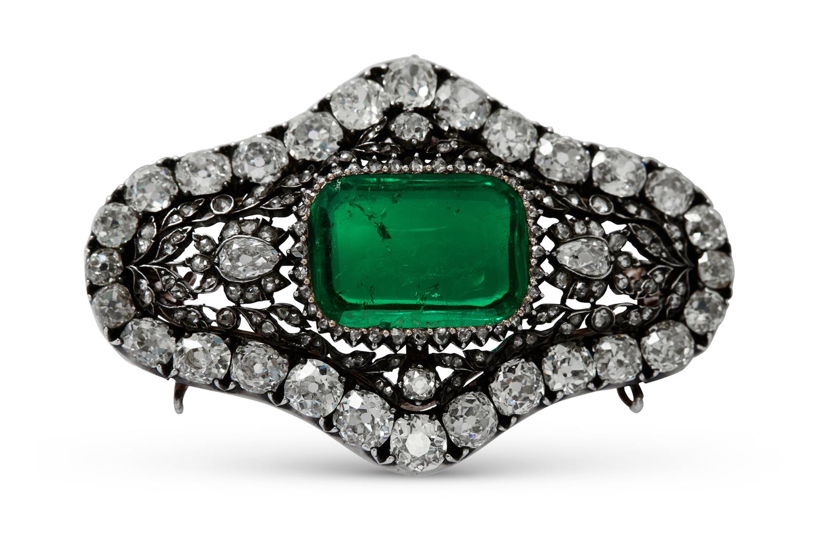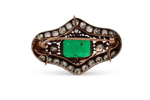 Centring a claw set cushion-shaped Colombian emerald weighing approximately 5.80 carats framed by rose-cut diamonds mounted in a pierced quatrefoil frame decorated with naturalistic foliate motifs embellished with old mine and rose-cut diamonds bordered on the outside by a line of 30 claw-set old cut diamonds, the diamonds together weighing approximately 10.58 carats, mounted in silver and gold, unmarked, length 50mm, width 30mm, pin detachable.