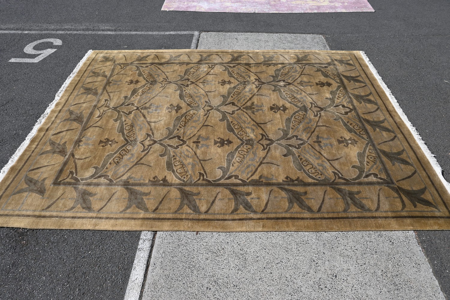 A LARGE HANDMADE WOOLEN RUG IN OLIVE TONES WITH FLORAL DESIGN (A/F) (370 X 276 CM) (PLEASE NOTE THIS HEAVY ITEM MUST BE REMOVED BY CARRIERS AT THE CUSTOMER'S EXPENSE. LEONARD JOEL STAFF CANNOT ASSIST CARRYING THIS ITEM) (X-LARGE ITEM)