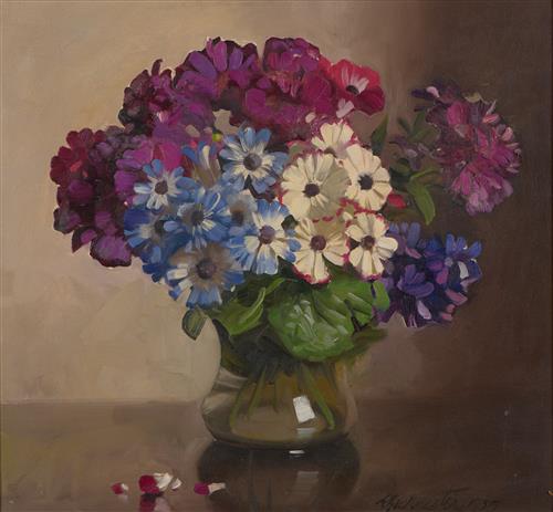 Work in good condition overall. Small area of paint loss present in the lower right hand corner. Some fly spotting on the surface present in the upper left hand corner. Housed in its original John Thallon frame (label verso), measuring 62 x 66cm.