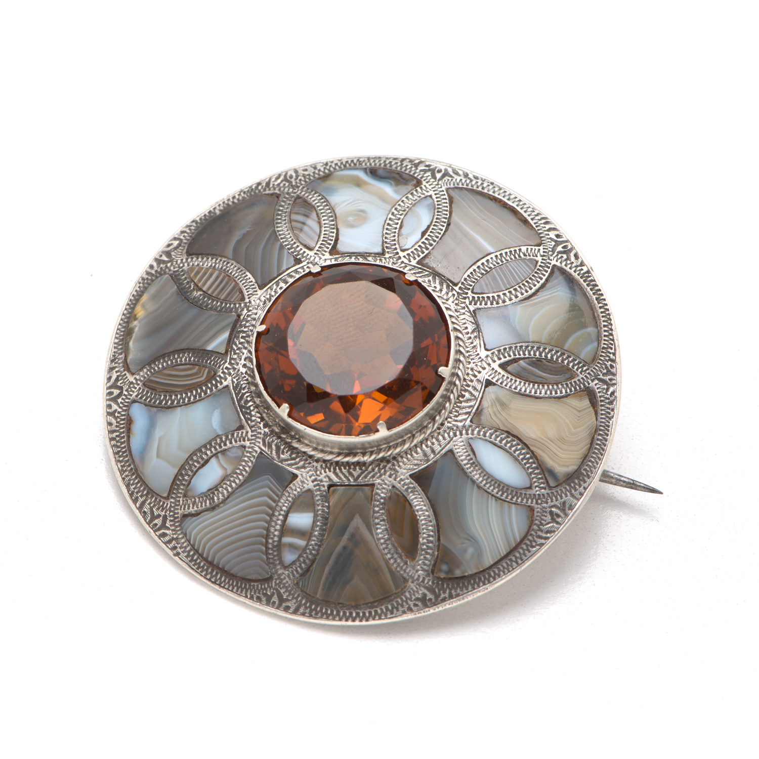A SCOTTISH AGATE AND CITRINE SET PENDANT/BROOCH IN STERLING SILVER, DIAMETER APPROXIMATELY 53MM