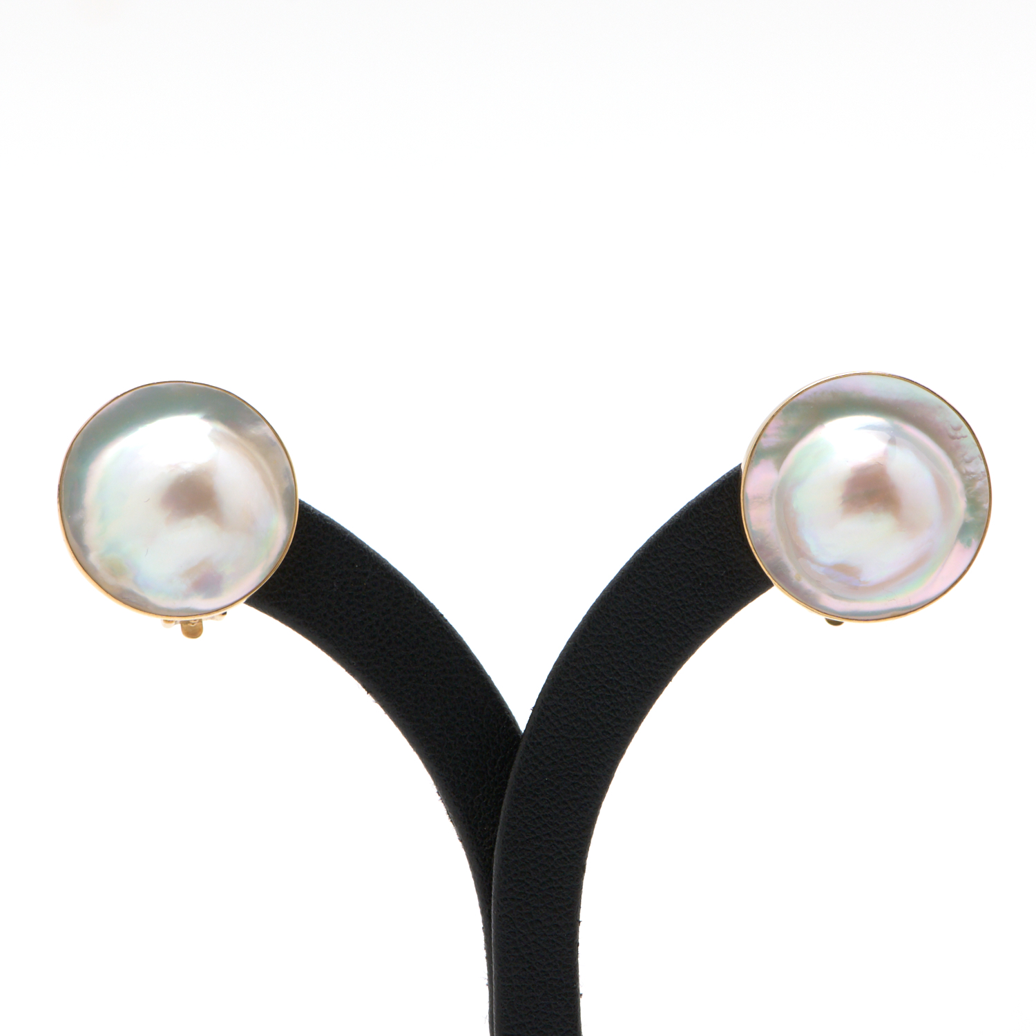 A PAIR OF MABE PEARL EARRINGS IN 14CT GOLD, TO CLIP ON FITTINGS, 8.2GMS