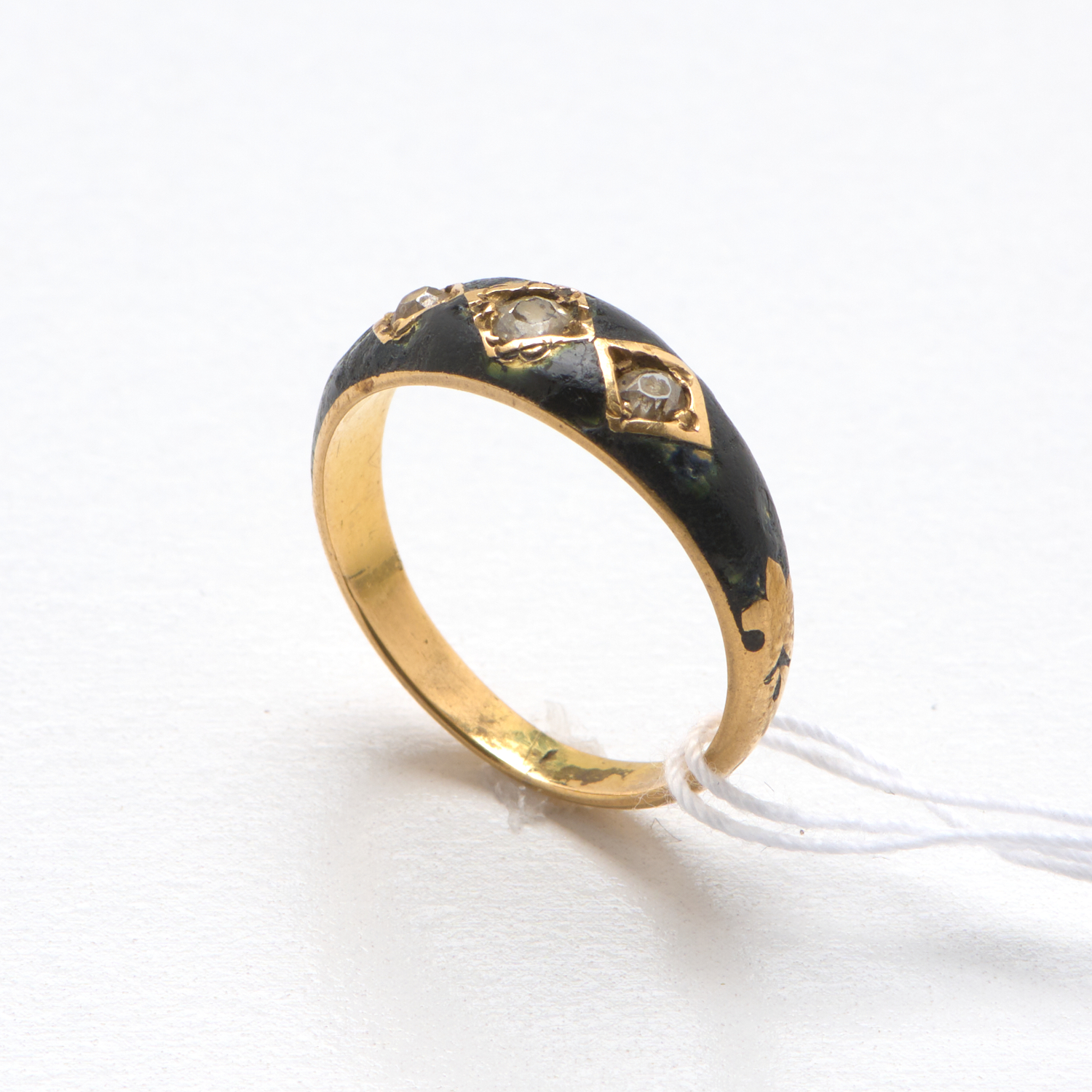 AN OLD EUROPEAN CUT DIAMOND AND ENAMEL SET MOURNING RING IN 18CT GOLD, RING SIZE P, 4.7GMS