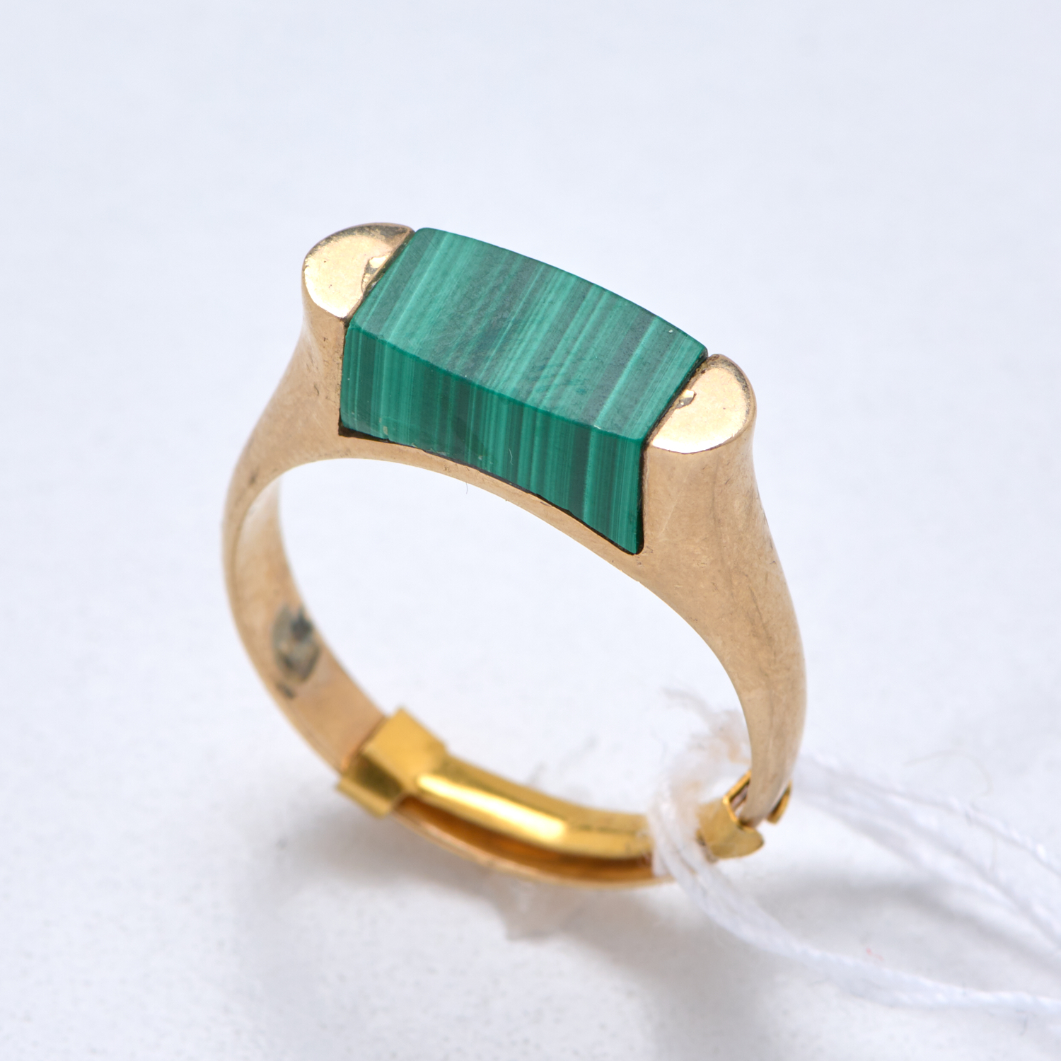 A MALACHITE SET RING IN 9CT GOLD, RING SIZE O, 4.7GMS