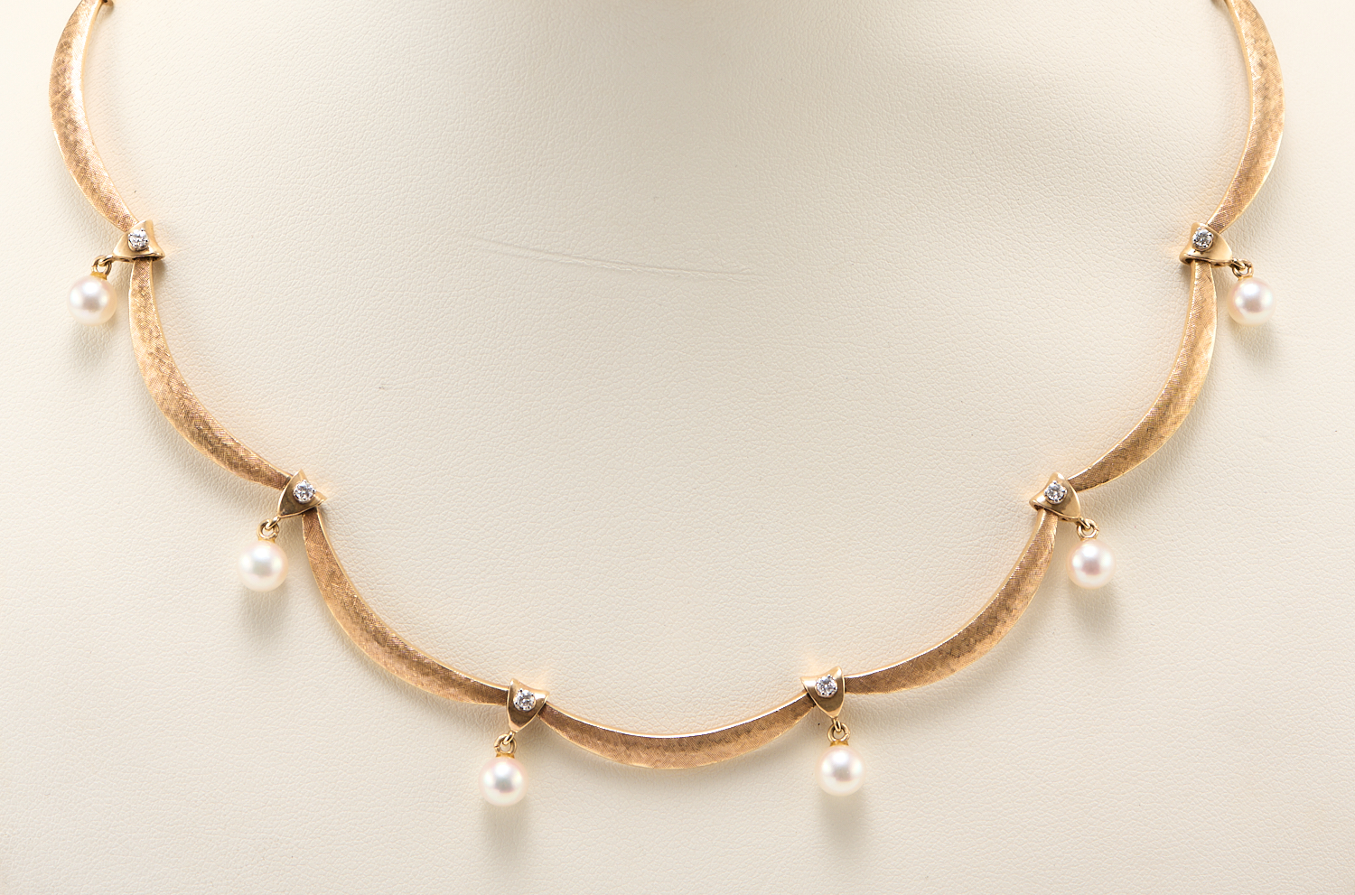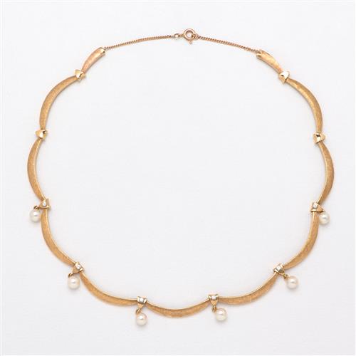 A PEARL AND DIAMOND SET NECKLACE IN 9CT GOLD, LENGTH 370MM, THE DIAMONDS TOTALLING APPROXIMATELY 0.3CTS, 22GMS