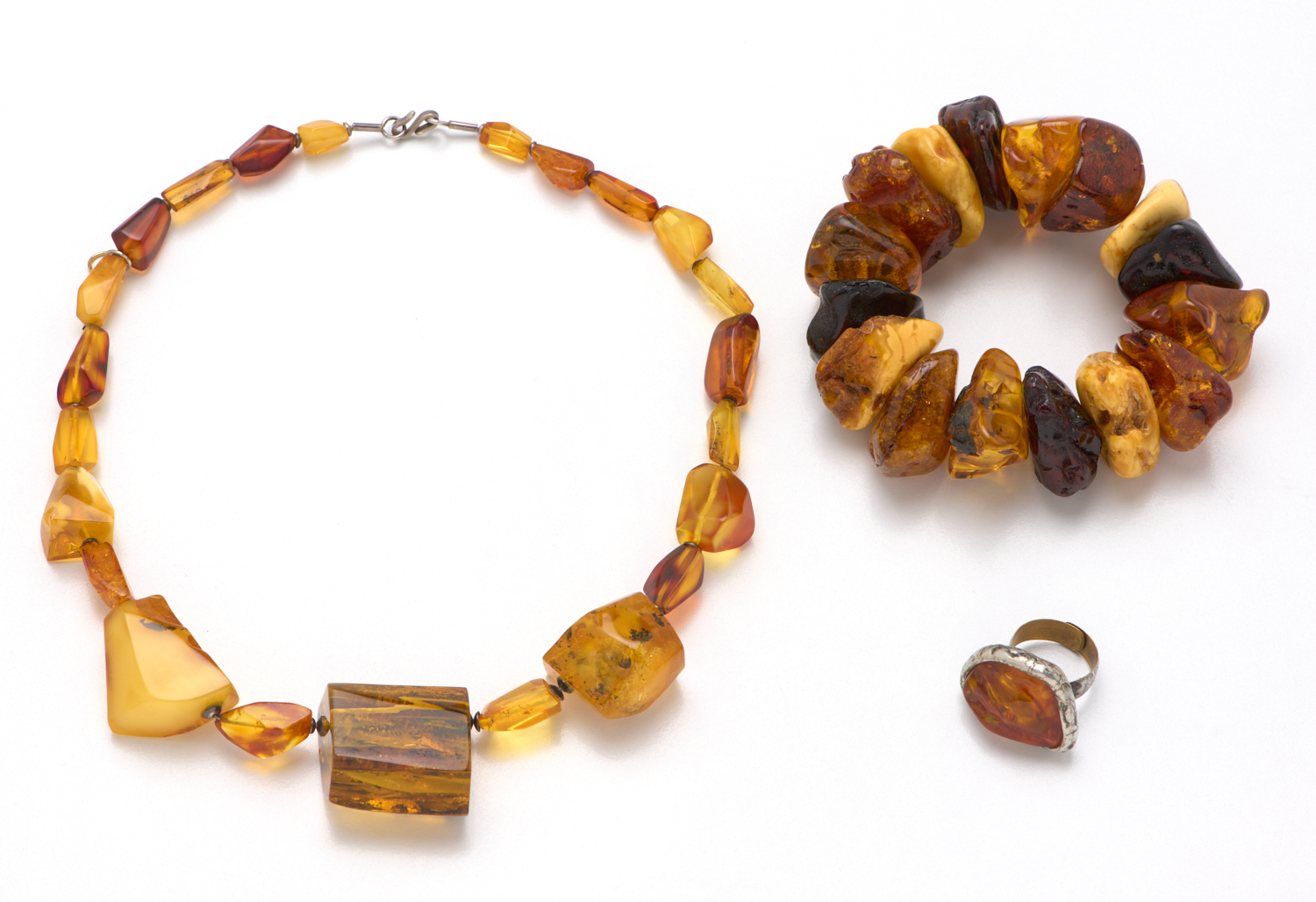 A COLLECTION OF BALTIC AMBER INCLUDING A FLEXIBLE BRACELET, NECKLACE TO SILVER CLASP AND A RING (ADJUSTABLE)