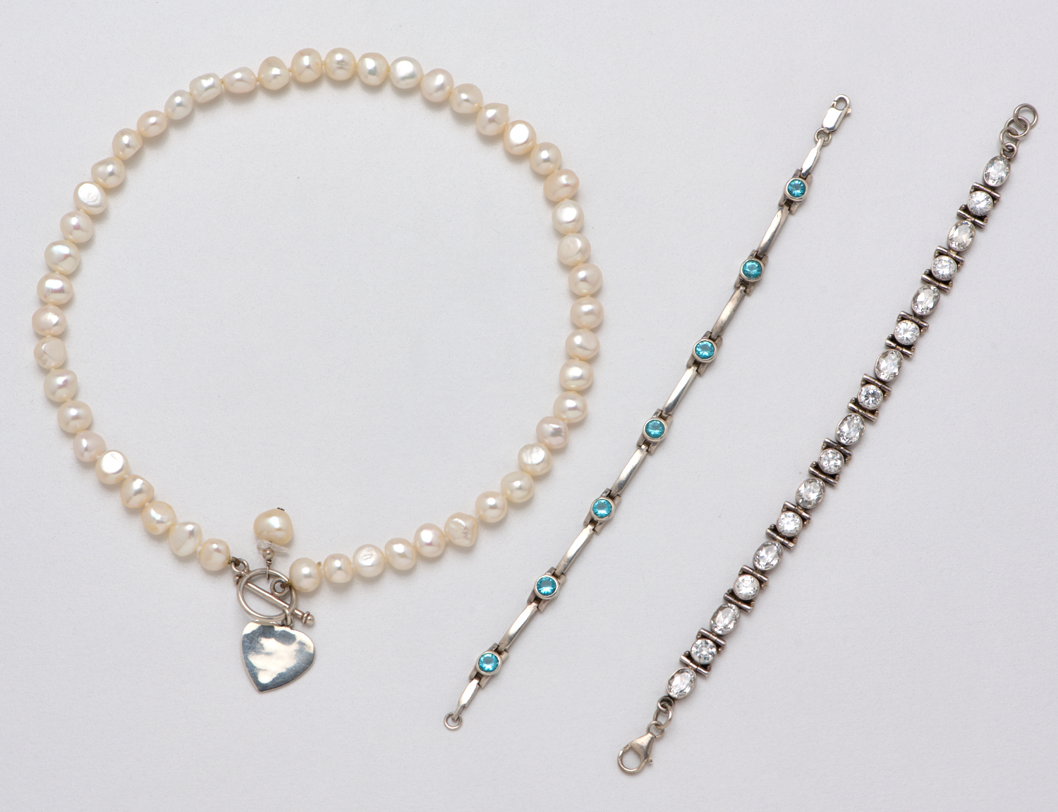 A COLLECTION OF SILVER JEWELLERY INCLUDING A FRESHWATER PEARL NECKLACE WITH HEART CHARM (440MM) AND TWO PASTE SET STERLING SILVER BRACELETS (BOTH 190MM)