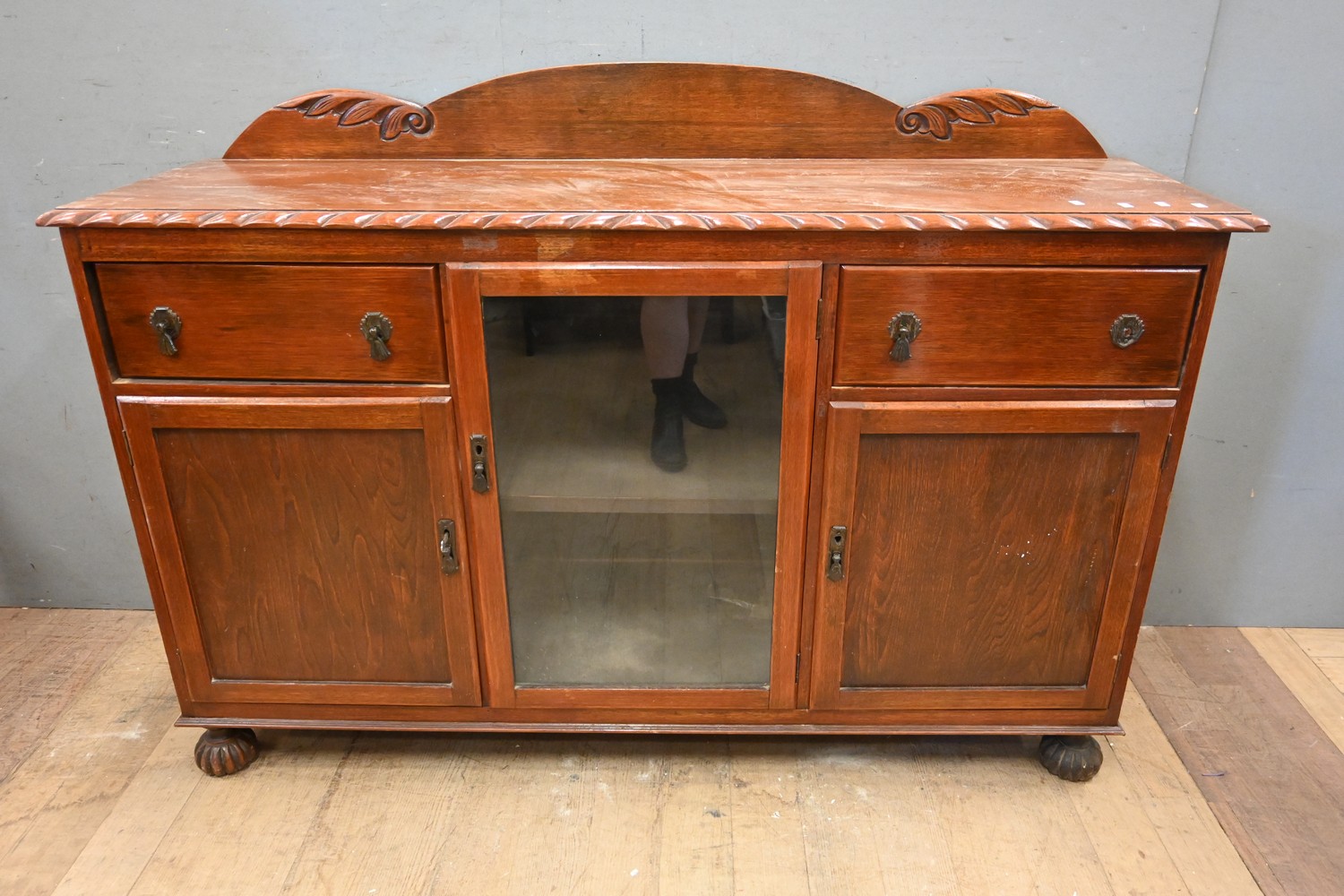 AN EARLY 20TH CENTURY OAK GLASS FRONT SIDEBOARD (A/F) ( 105H X 153W X 45D CM) (PLEASE NOTE THIS HEAVY ITEM MUST BE REMOVED BY CARRIERS AT THE CUSTOMER'S EXPENSE. LEONARD JOEL STAFF CANNOT ASSIST CARRYING THIS ITEM) (X-LARGE ITEM)