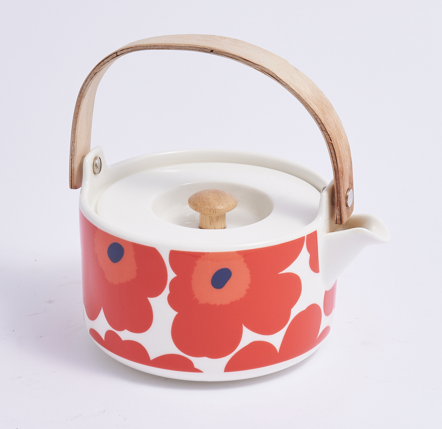 A MARIMEKKO UNIKKO TEAPOT WITH STRAINER AND DESIGN BY MAIJA ISOLA H.17CM, LEONARD JOEL LOCAL DELIVERY: SMALL