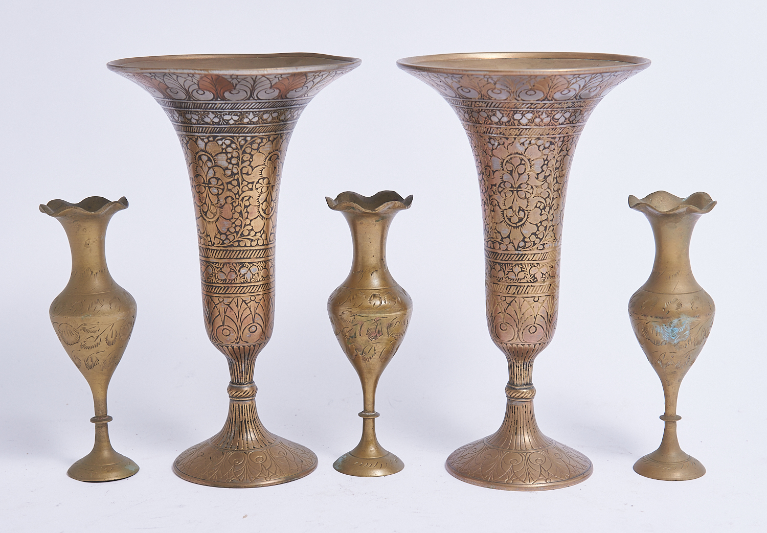TWO ETCHED BRASS VASES TOGETHER WITH THREE BRASS CANDLESTICKS H.21.5CM, LEONARD JOEL LOCAL DELIVERY: SMALL