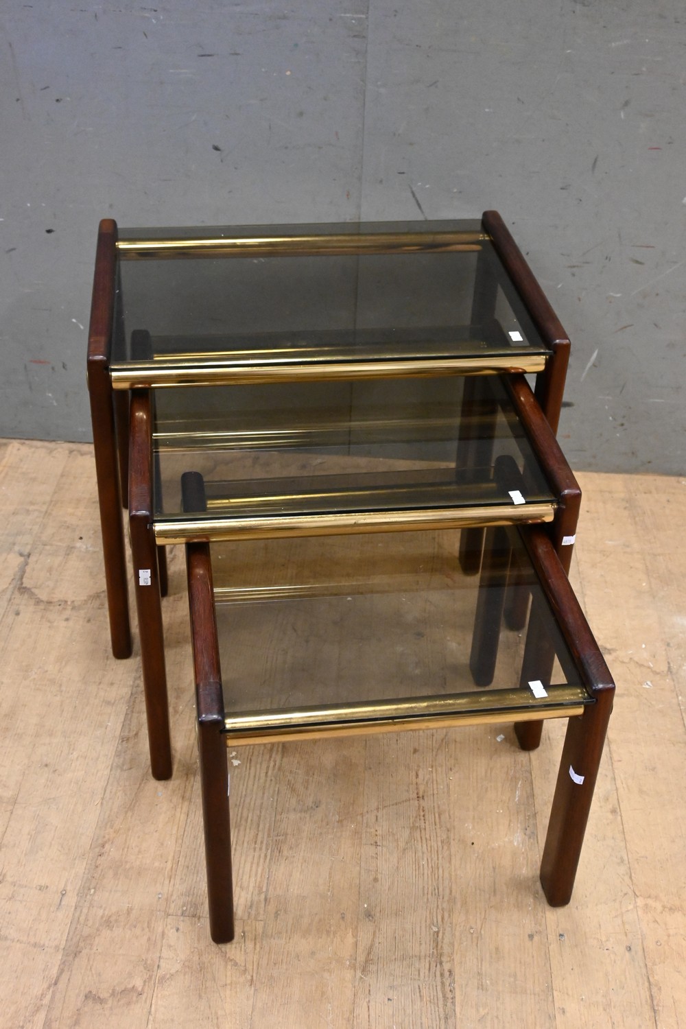 A NEST OF THREE DANISH GLASS TOPPED TABLES ( 50H X 59W X 41D CM) (LEONARD JOEL DELIVERY SIZE: LARGE)
