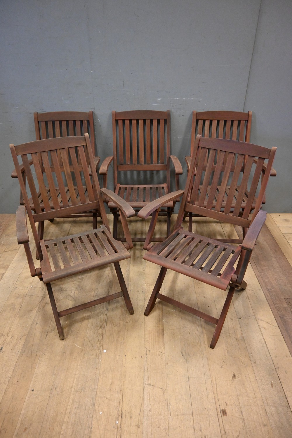 A SET OF FIVE TEAK OUTDOOR ARMCHAIRS (A/F) ( 91H X 55W X 66D CM) (LEONARD JOEL DELIVERY SIZE: X-LARGE)