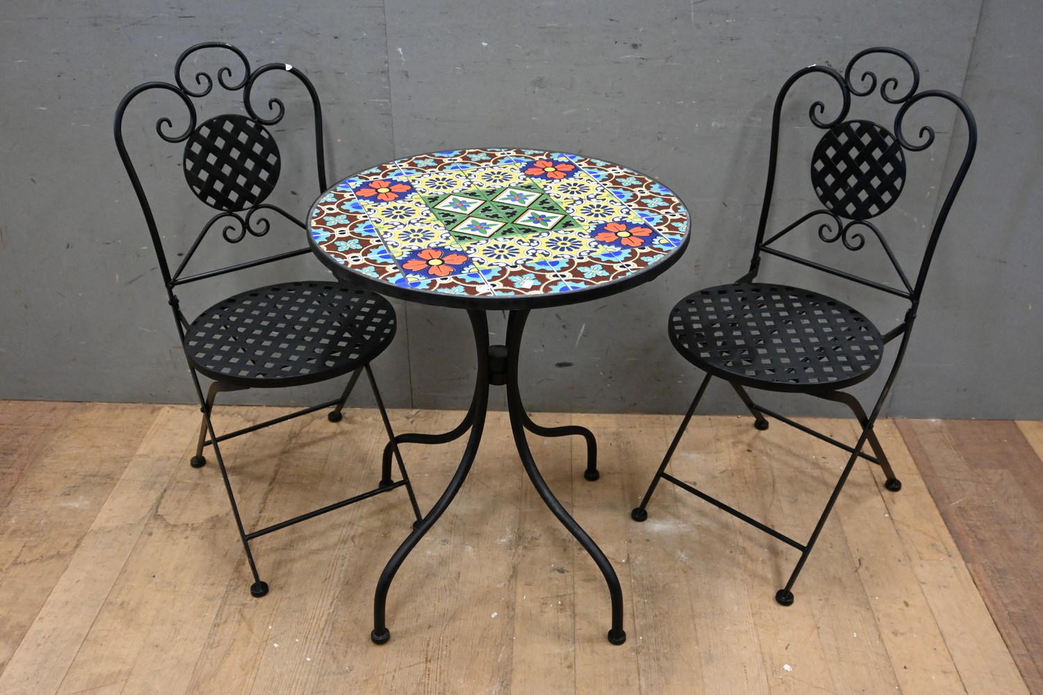 A THREE PIECE OUTDOOR SETTING WITH TILE TOP ( 71H X 61 DIAMETER CM) (LEONARD JOEL DELIVERY SIZE: X-LARGE)