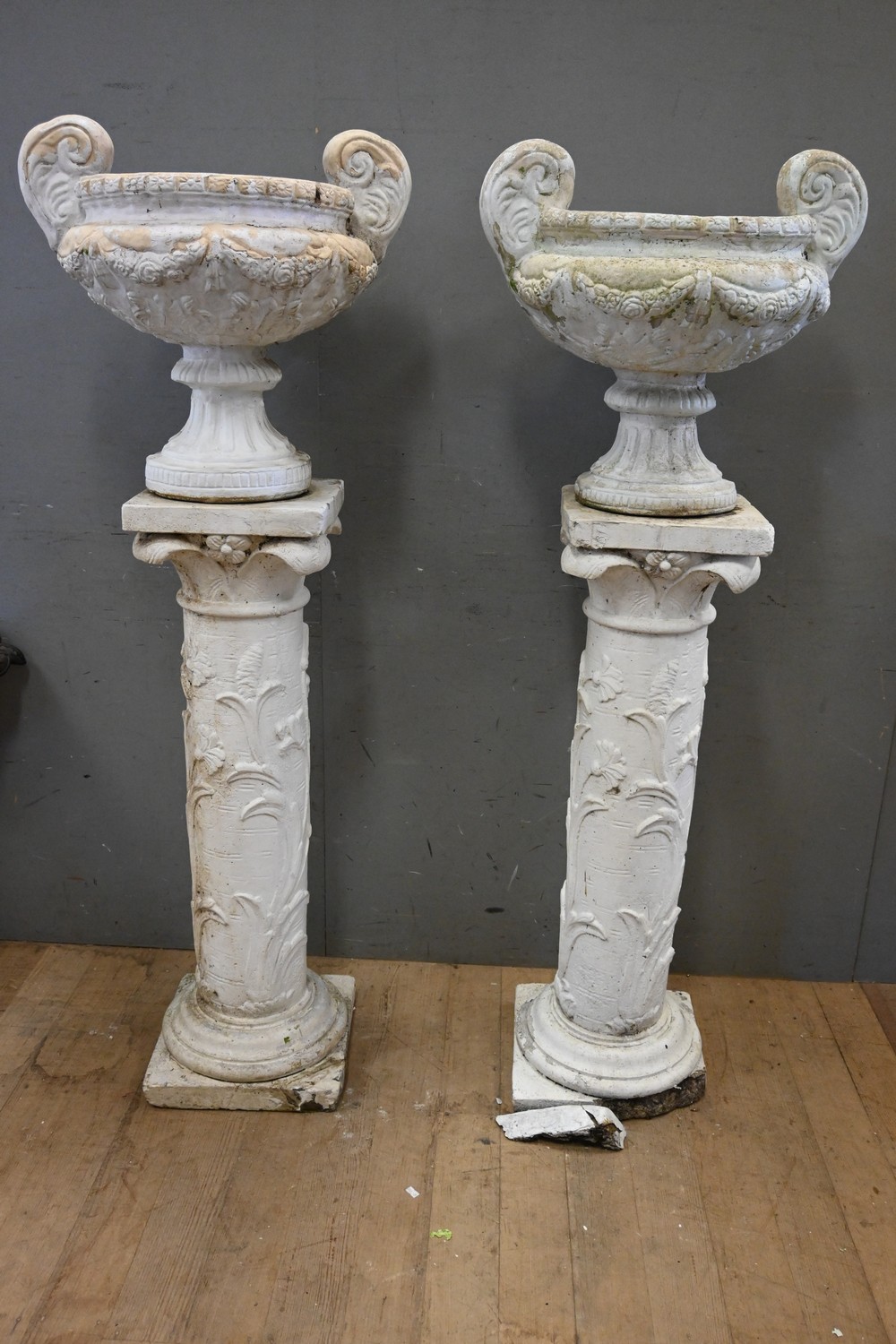 A PAIR OF CLASSICAL STYLE CONCRETE URNS ON PLYNTHS (A/F) ( 156H X 57W X 54D CM) (PLEASE NOTE THIS HEAVY ITEM MUST BE REMOVED BY CARRIERS AT THE CUSTOMER'S EXPENSE. LEONARD JOEL STAFF CANNOT ASSIST CARRYING THIS ITEM) (X-LARGE ITEM)