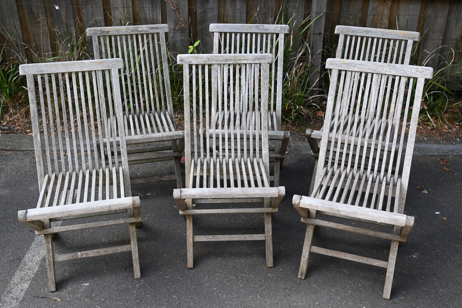 A SET OF SIX FOLDING TEAK OUTDOOR CHAIRS (A/F) (90H X 49W X 56D CM) (LEONARD JOEL DELIVERY SIZE: X-LARGE)