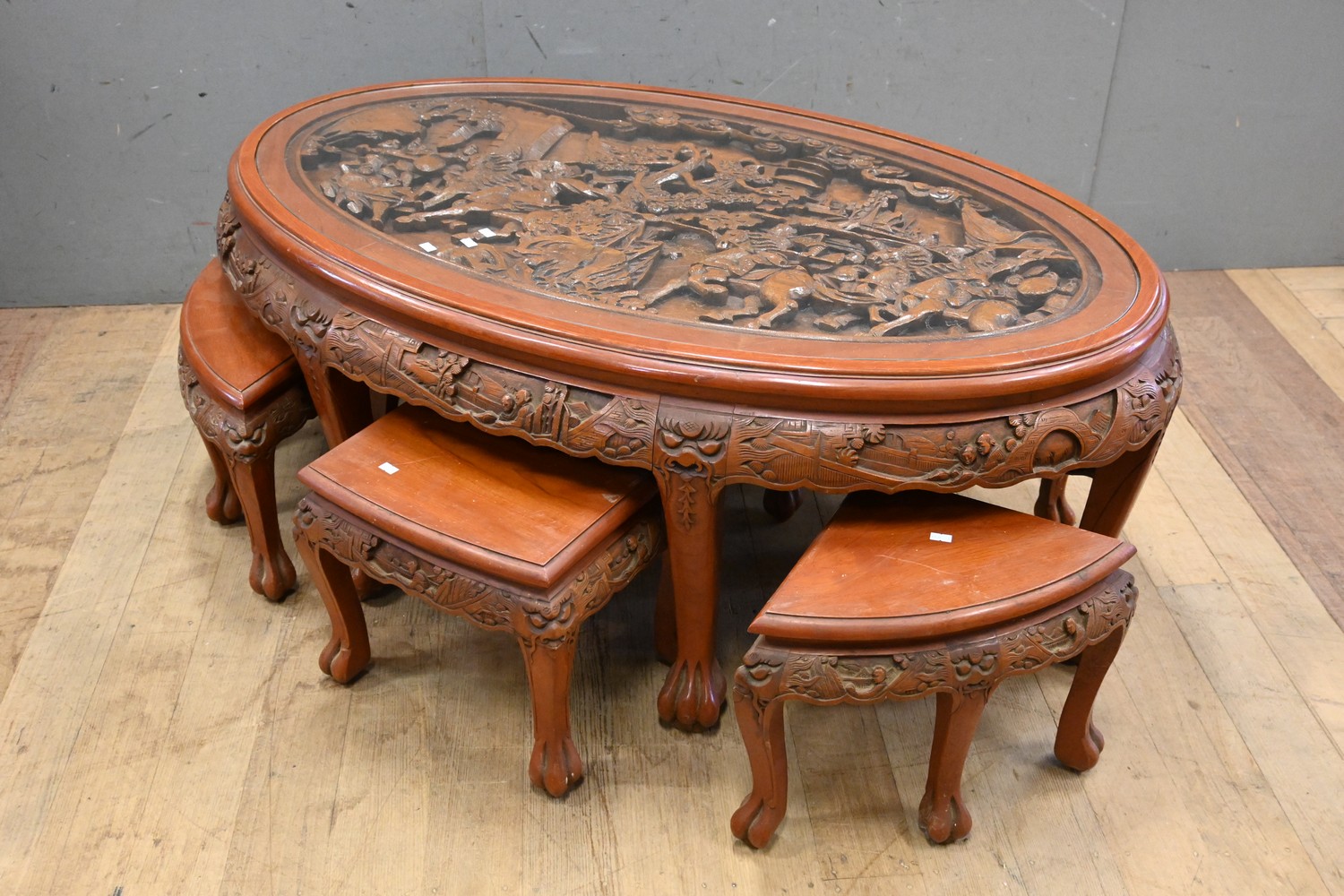 A CHINESE DECORATIVELY CARVED GLASS TOP COFFEE TABLE WITH STOOLS (51H X 127W X 77D CM) (LEONARD JOEL DELIVERY SIZE: X-LARGE)