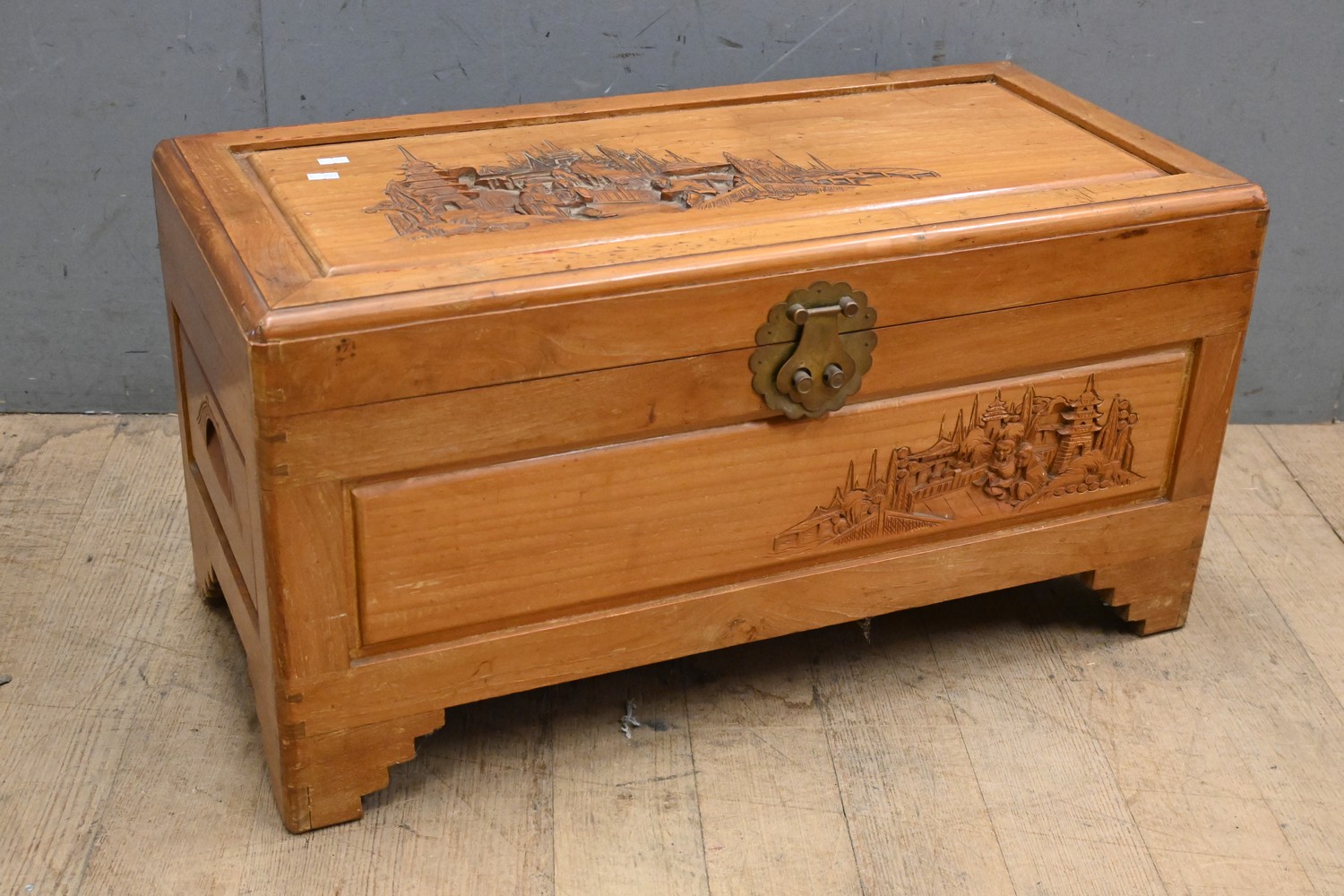 A CHINESE DECORATIVELY CARVED CHEST (40H X 78W X 38D CM) (LEONARD JOEL DELIVERY SIZE: X-LARGE)