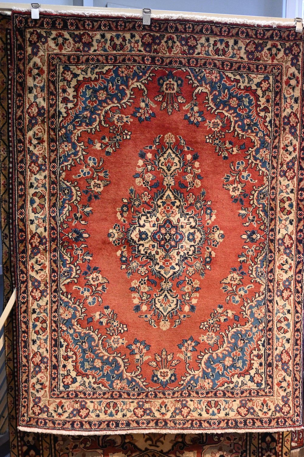 A PERSIAN SAROUQ MAHAL RUG, 100% WOOL. HAND-KNOTTED VILLAGE WEAVE WITH CLASSIC PERSIAN CENTRAL MEDALLION ON A RED FIELD OF ALL OVER FLORAL DESIGN OF PALMETTES AND FLORAL SPRAYS. FLORAL BORDER OF ROSETTES. SIZE: 190 X 138 CM ORIGIN: PERSIA - RRP: $1,700 DOCUMENTATION OF AUTHENTICITY INCLUDED.