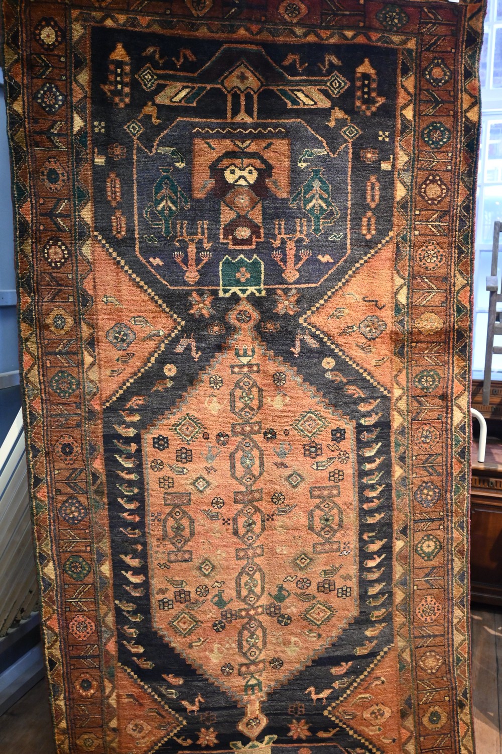 A NOMADIC PERSIAN SHAHSAVAN RUG, 100% WOOL, NATURAL DYES. HAND-KNOTTED NOMADIC WEAVE AND DESIGN OF BOLD HEXAGONAL ELONGATED CENTRAL MEDALLION. ALL OVER TRIBAL MOTIFS ON A CHARCOAL FIELD.  BORDER OF TRIBAL ROSETTES & MOTIFS. SOME ABRASH. SIZE: 320 X 134 CM- ORIGIN: IRAN - RRP: $2,900 DOCUMENTATION OF AUTHENTICITY INCLUDED.