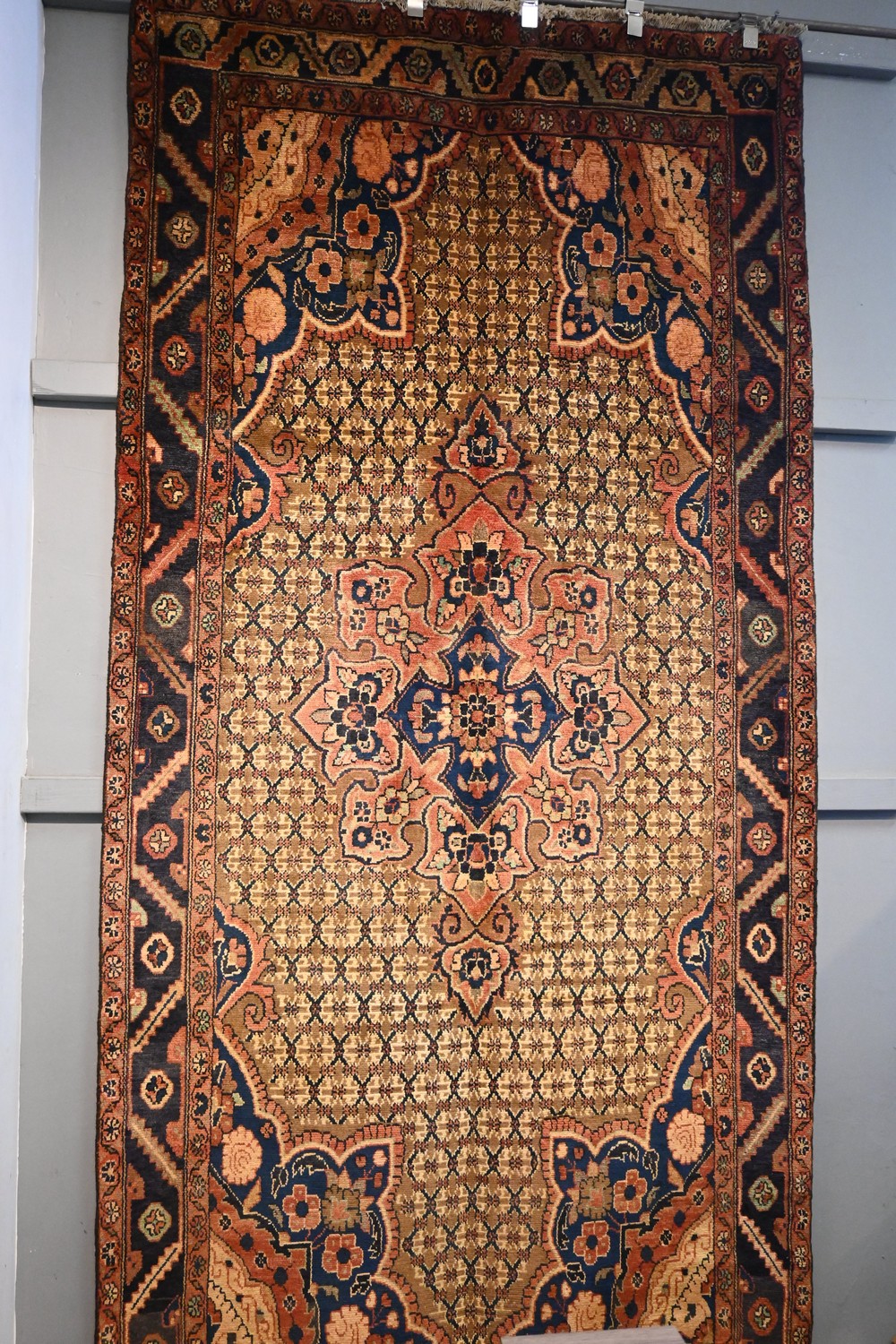 A MARVELLOUS SONGOR PERSIAN KOLYAIE RUG 100% WOOL PILE. SOLID & DENSE. HAND-KNOTTED WEAVE FROM THE KURDISTAN REGION WITH DESIGN OF LARGE DIAMOND FLORAL MEDALLION IN PEACH AND BLUE TONES ON A LATTICE-PATTERNED FIELD. FLORAL CORNER MEDALLIONS IN PERSIAN BLUE & RUST TONES. TRIBAL-PATTERNED BORDER. SIZE: 298 X 143 CM- ORIGIN: PERSIA - RRP: $3,300 DOCUMENTATION OF AUTHENTICITY INCLUDED.