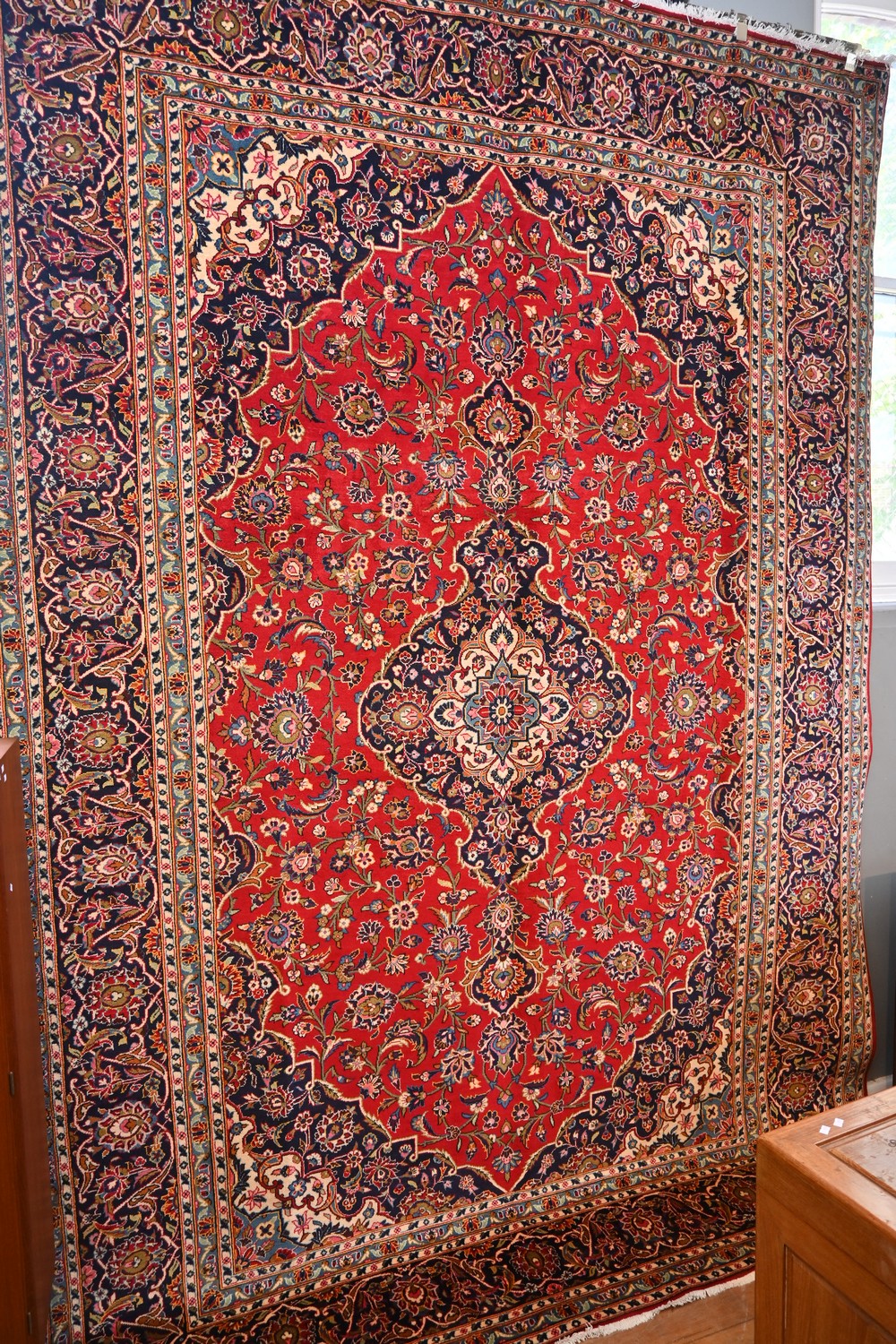 A CLASSIC PERSIAN KASHAN CARPET, 100% HAND KNOTTED SUPER FINE WOOL- SOLID PILE. IN EXCELLENT CONDITION. CLASSIC KASHAN BOOK-COVER DESIGN OF ELONGATED FLORAL MEDALLION & CORNER MEDALLIONS IN PERSIAN BLUE FIELD ON A ROYAL RED FIELD OF SHAH ABBASI PALMETTES, FLORAL MOTIFS & TENDRILS. BORDER IN PERSIAN BLUE OF PALMETTES. KASHAN CARPETS ARE WELL RENOWNED FOR THEIR LONGEVITY AND CONSIDERED AS MOST HARD WEARING OF ALL PERSIAN RUGS. RRP: $5,900- SIZE: 359 X 242 CM ORIGIN: IRAN DOCUMENTATION OF AUTHENTICITY INCLUDED.