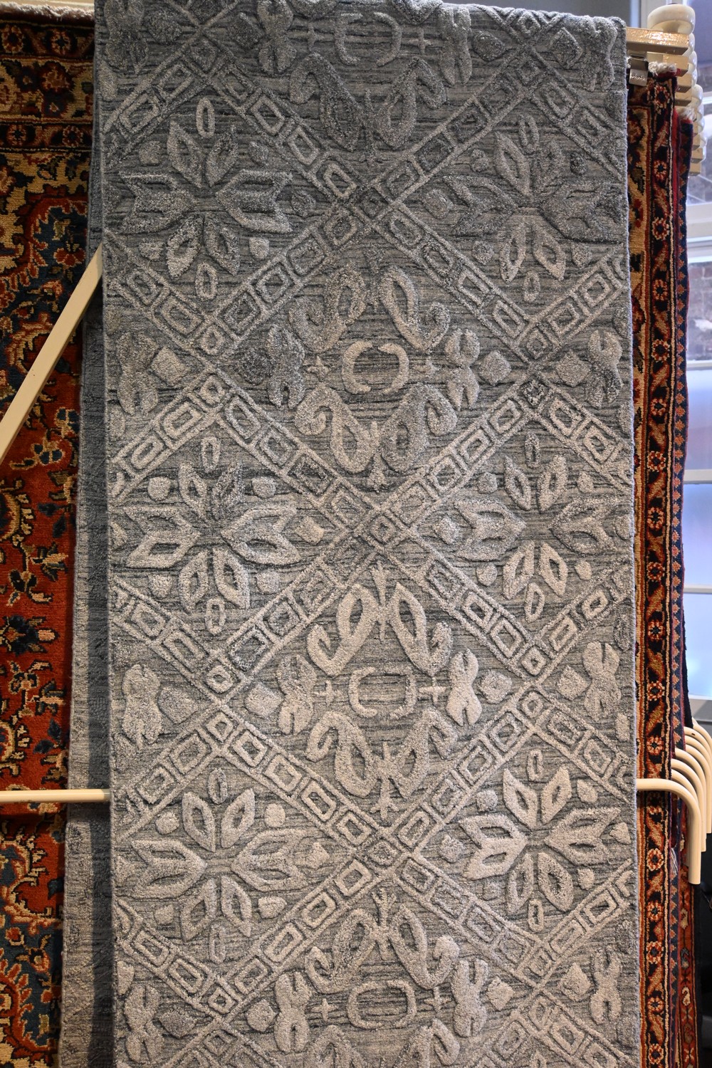 EMBOSSED MODERN RUNNER. HANDLOOMED. SOFT BLUE HUES. 100% VISCOSE. SIZE: 412 X 85 CM ORIGIN: INDIA