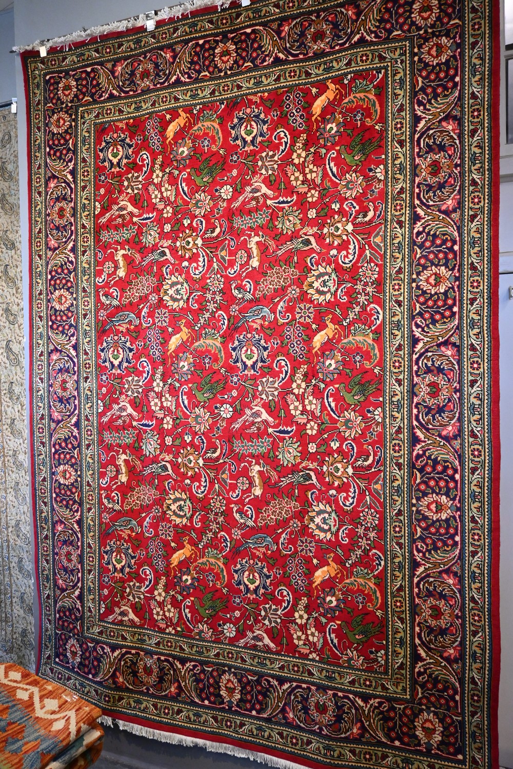 A MAGNIFICENT 'GARDEN OF PARADISE 'TABRIZ CARPET. 100% WOOL, EXTREMELY SOLID AND DENSE LUSTROUS PILE. THE RARE DESIGN DEPICTING ANIMAL FORMS OF PEACOCKS, PARROTS AND BIRDS OF PHOENIX. SET ON A LOVELY CRIMSON BACKGROUND AND FLORAL SPRAYS. THE ENTIRE IN SKY BLUE, TAN & PEACH TONES. A TRULY UNIQUE PIECE. BORDER IN PISTACHIO GREEN. SIZE: 295 X 200 CM- ORIGIN: PERSIA - RRP: $4,800 DOCUMENTATION OF AUTHENTICITY INCLUDED.