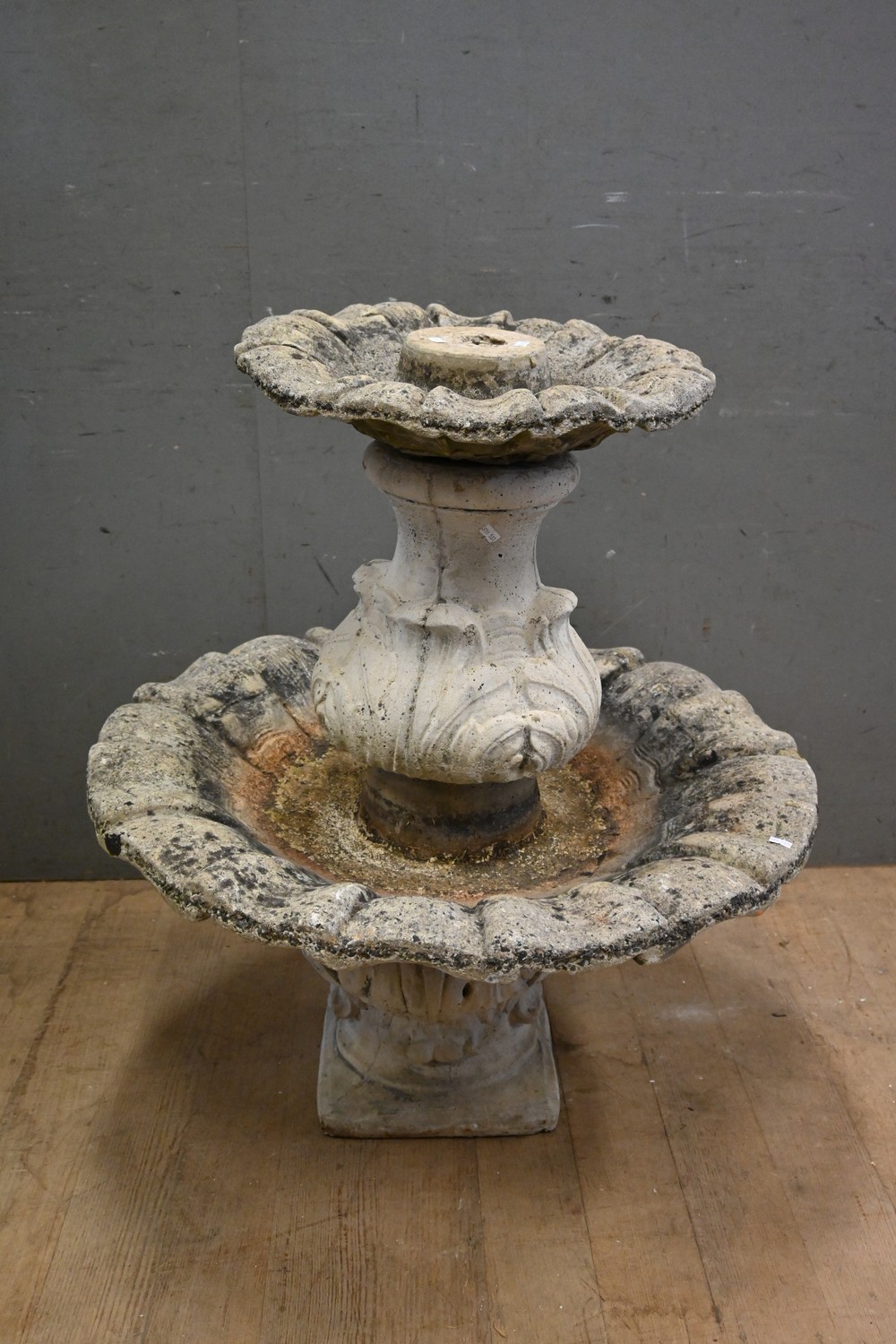 A FOUR PIECE RECONSTITUTED STONE BIRD BATH WATER FOUNTAIN WITH TWO TIERS ( A/F) ( 90H X 82 DIAMETER CM) (PLEASE NOTE THIS HEAVY ITEM MUST BE REMOVED BY CARRIERS AT THE CUSTOMER'S EXPENSE. LEONARD JOEL STAFF CANNOT ASSIST CARRYING THIS ITEM) (X-LARGE ITEM)