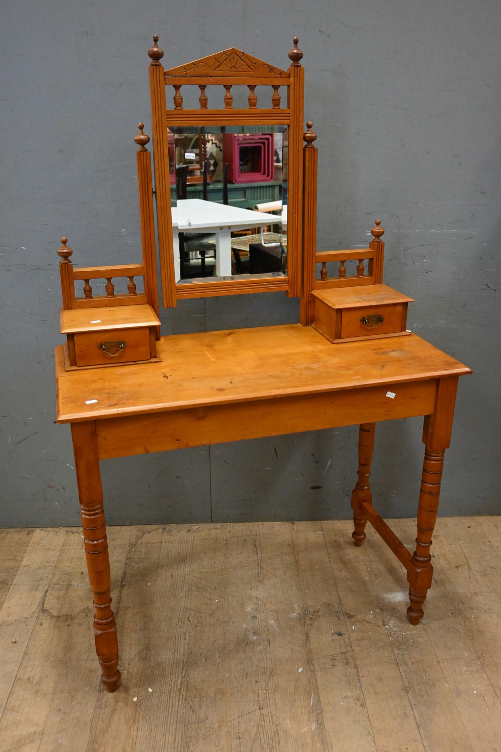 AN AUSTRALIAN HUON PINE DRESSING TABLE WITH ORIGINAL BEVELLED MIRROR AND TURNINGS ( A/F) ( 144H X 92W X 45D CM) (LEONARD JOEL DELIVERY SIZE: X-LARGE)