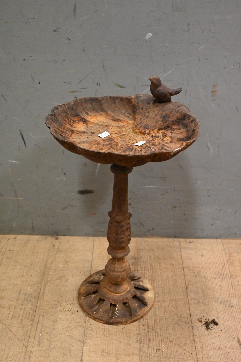 A CAST-IRON SHELL FORM BIRD BATH WITH ORIGINAL BIRD TO SIDE (44H X 27D CM) (LEONARD JOEL DELIVERY SIZE: MEDIUM)