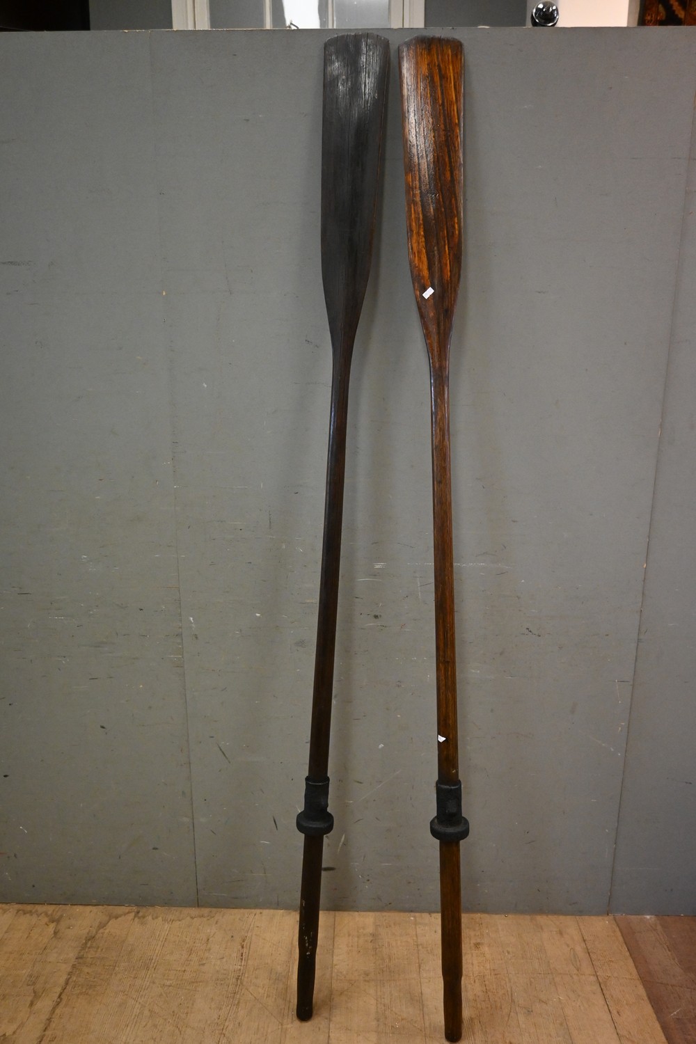 A PAIR OF EARLY 20TH CENTURY AUSTRALIAN OAK OARS (A/F) (208H CM) (LEONARD JOEL DELIVERY SIZE: LARGE)