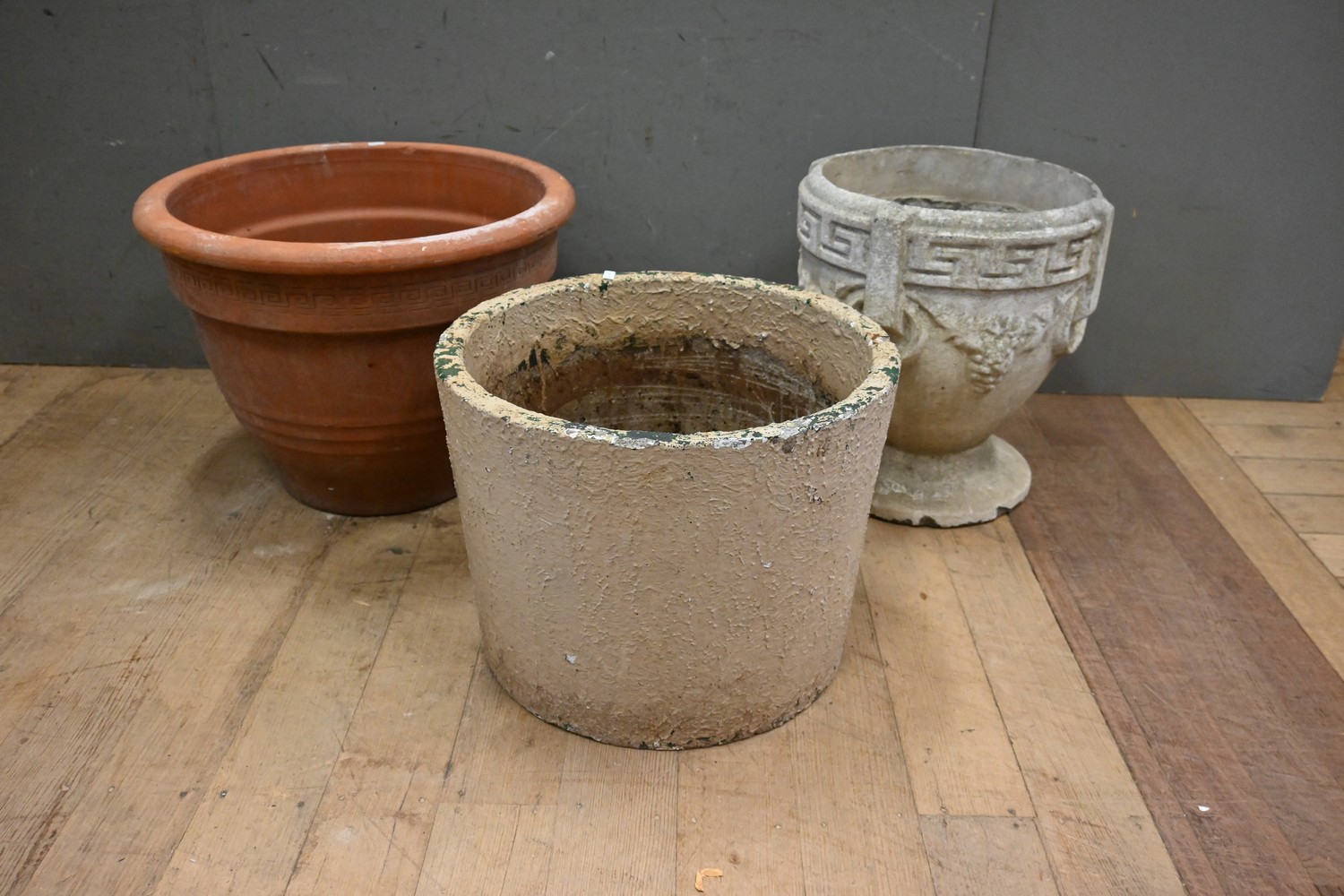 A COLLECTION OF THREE VINTAGE CONCRETE AND TERRACOTTA GARDEN POTS INCLUDING GREEK KEY AND MEDUSA PATTERN (A/F) (40H X 53D CM) (PLEASE NOTE THIS HEAVY ITEM MUST BE REMOVED BY CARRIERS AT THE CUSTOMER'S EXPENSE. LEONARD JOEL STAFF CANNOT ASSIST CARRYING THIS ITEM) (X-LARGE ITEM)
