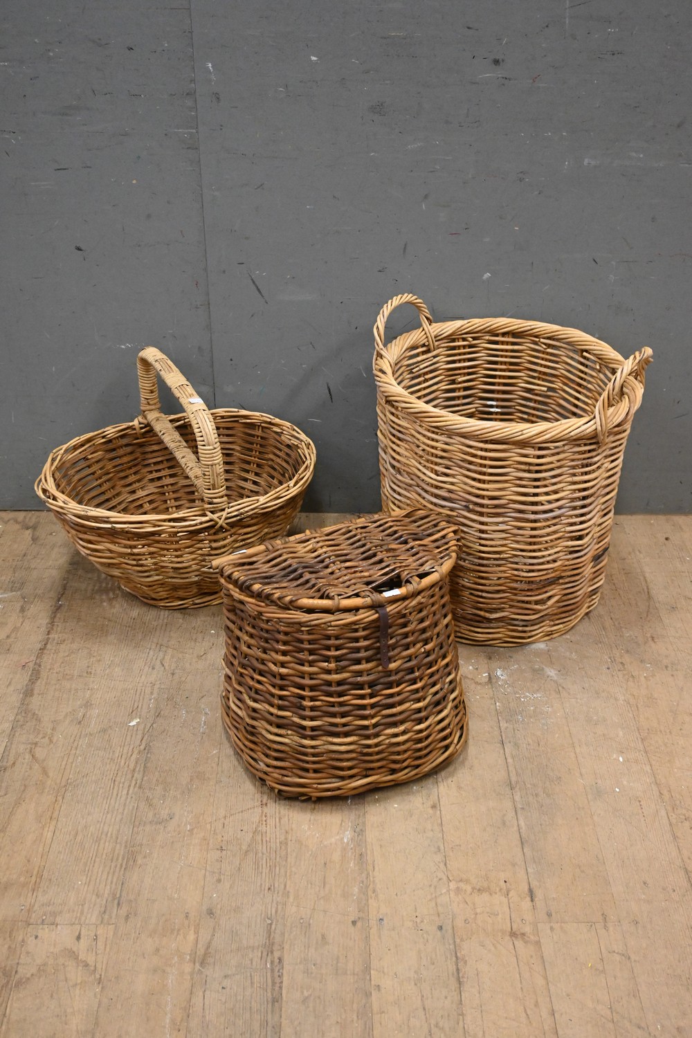 COLLECTION OF THREE VINTAGE HEAVY WOVEN CANE BASKETS AND ANTIQUE FISHING CREEL ( 54H X 44 DIAMETER CM) (LEONARD JOEL DELIVERY SIZE: LARGE)