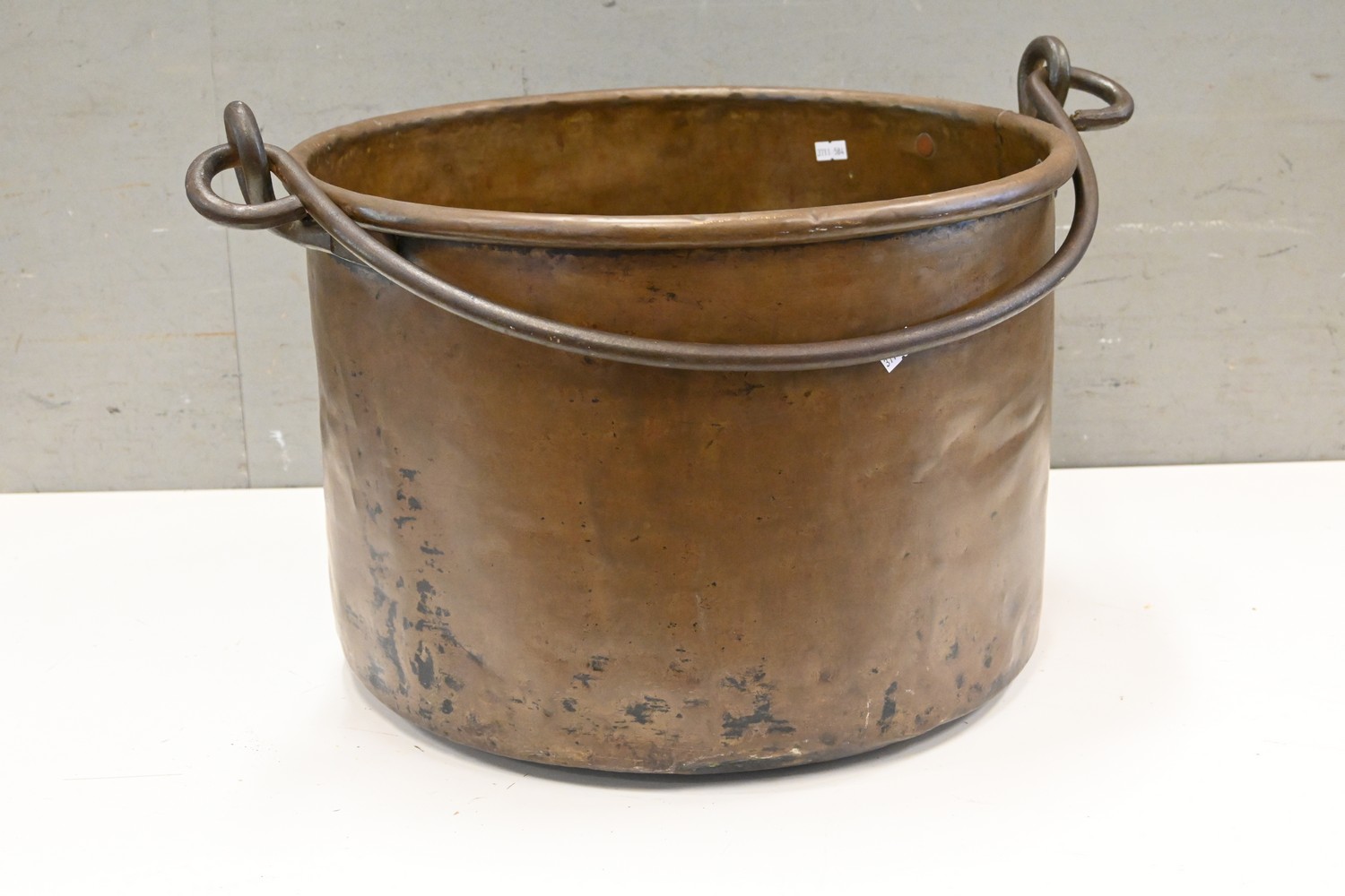 A FRENCH COPPER CAULDRON POT WITH ORIGINAL WROUGHT IRON SWING HANDLE (35H X 56D CM) (LEONARD JOEL DELIVERY SIZE: MEDIUM)