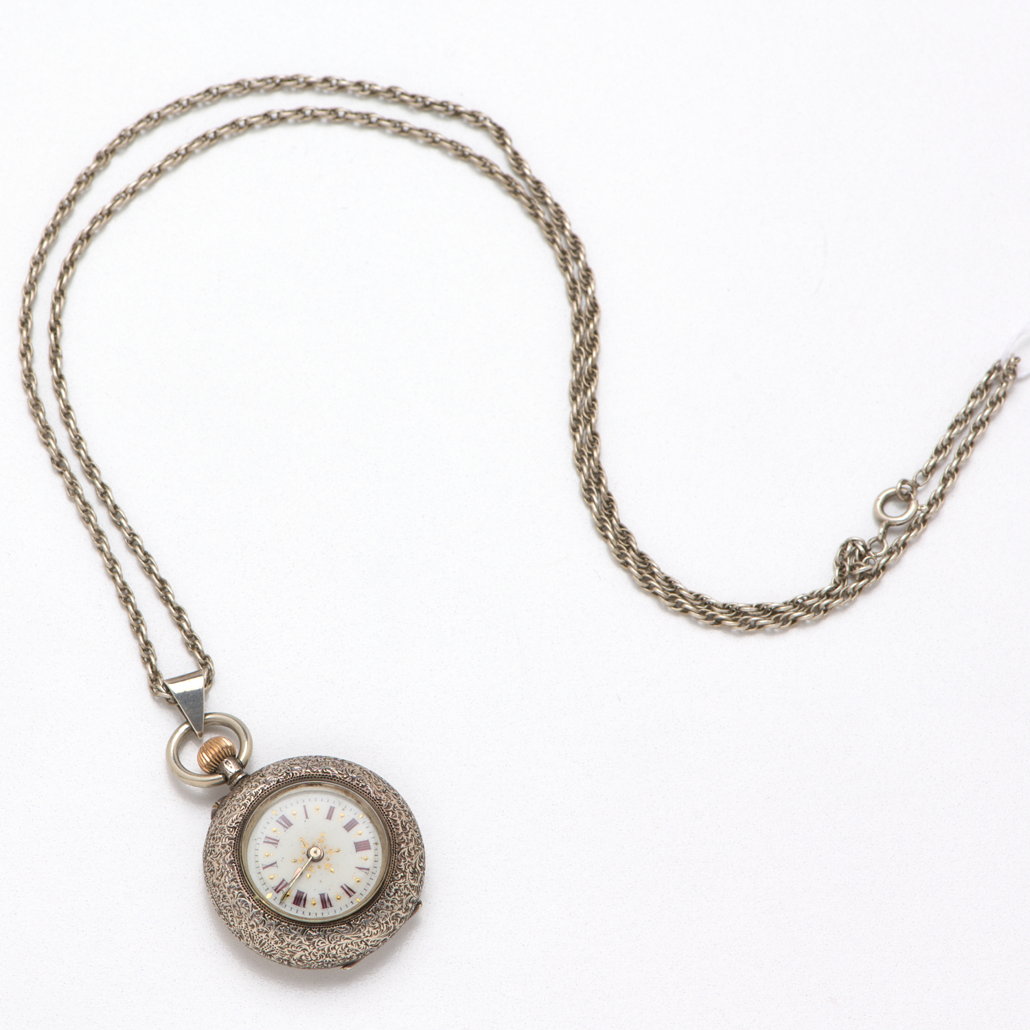 AN ANTIQUE STERLING SILVER FOB WATCH AND CHAIN, DIAMETER APPROXIMATELY 33MM