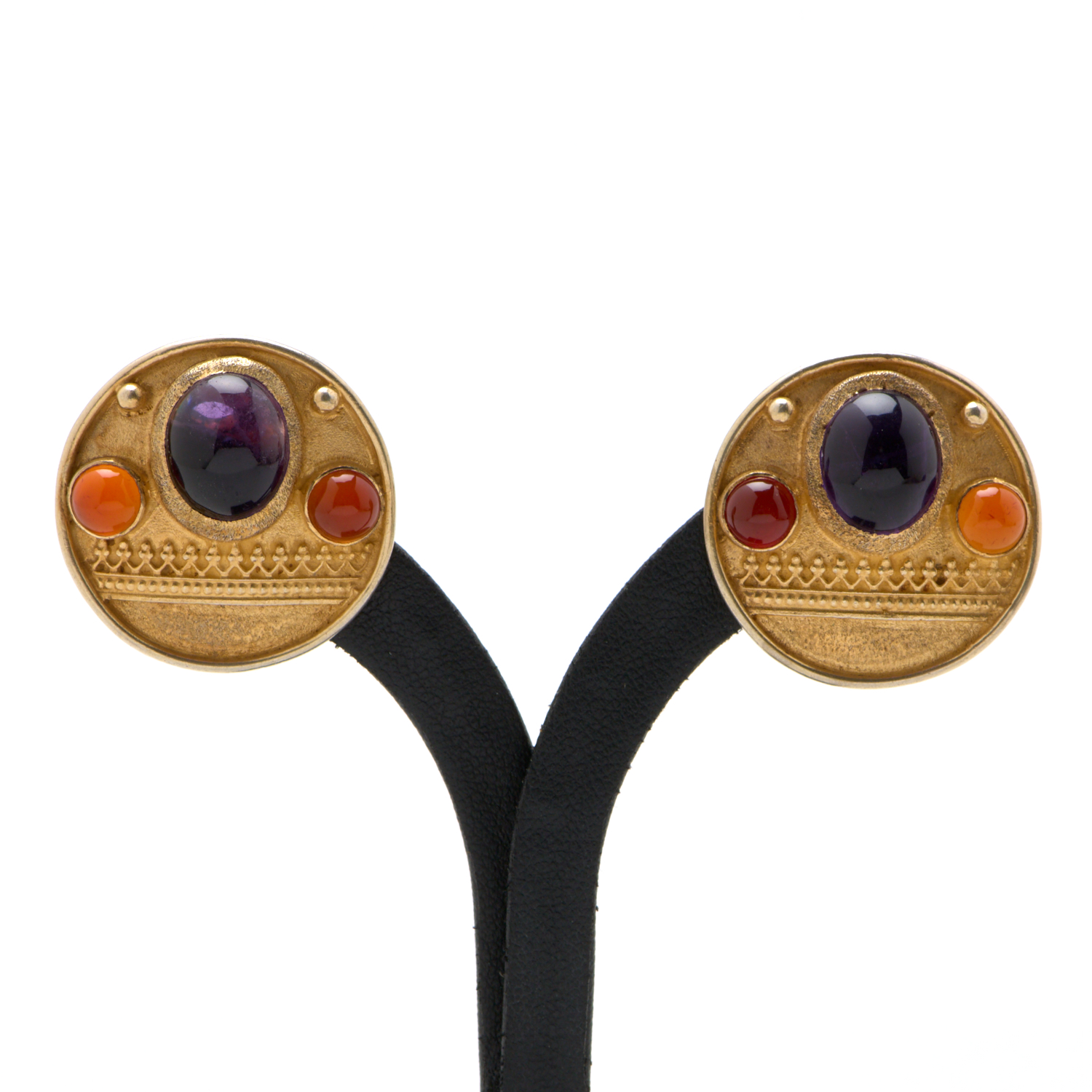 A PAIR OF ETRUSCAN REVIVAL STYLE EARRINGS IN SILVER GILT, SET WITH AMETHYST AND CARNELIAN, TO CLIP ON FITTINGS